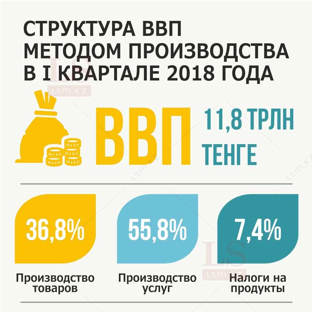 В I квартале 2018 года ВВП Казахстана составил почти 12 трлн тенге. LS представляет инфографику о структуре ВВП методом производства.