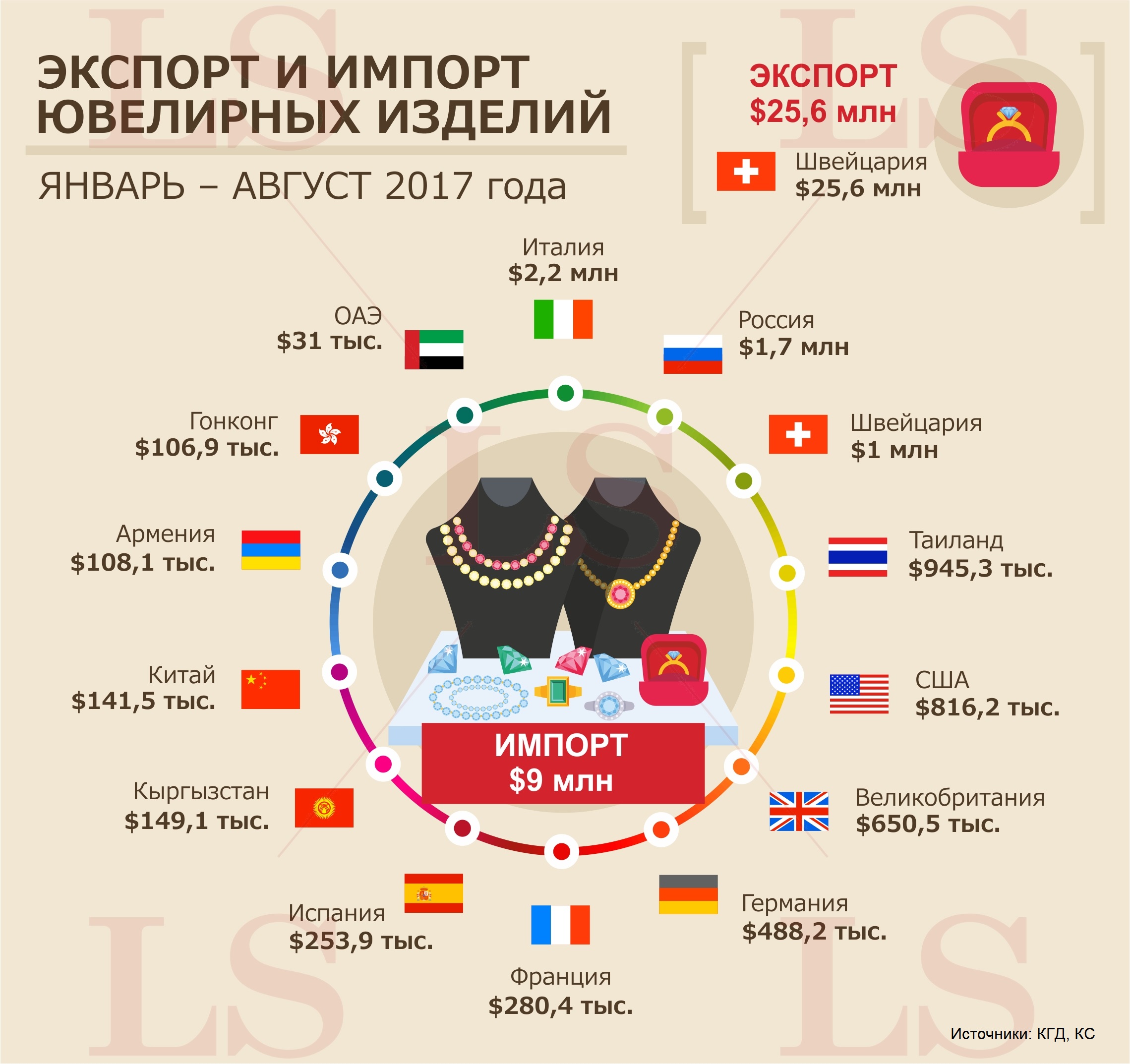Больше всего драгоценностей было привезено из Италии ($2,2 млн), России ($1,7 млн) и Швейцарии ($1 млн). Однако, помимо этого, значительный объем украшений был завезен из Таиланда (на $945,3 тыс.), США ($816,2 тыс.) и Великобритании ($650,5 тыс.).
