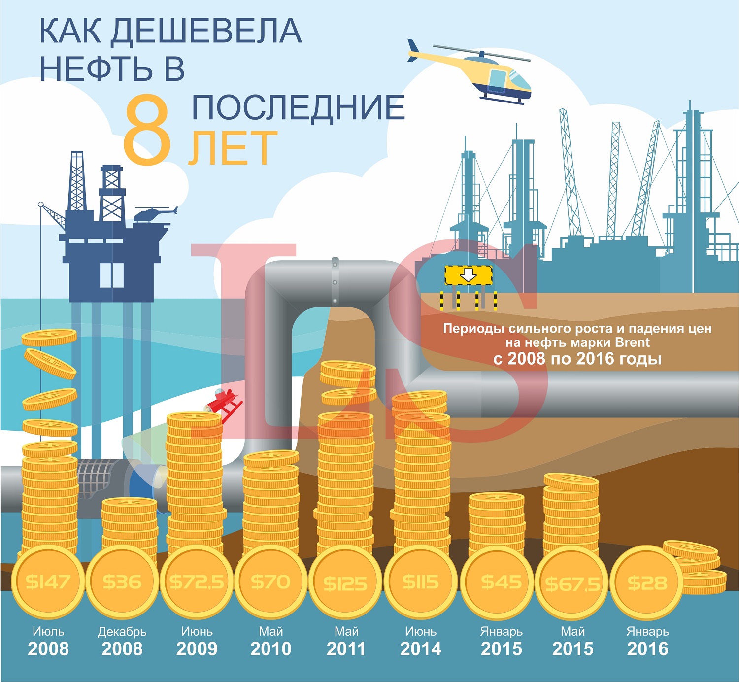 В обзоре указаны причины изменения стоимости нефти марки Brent в период с 2008 по 2016 годы.