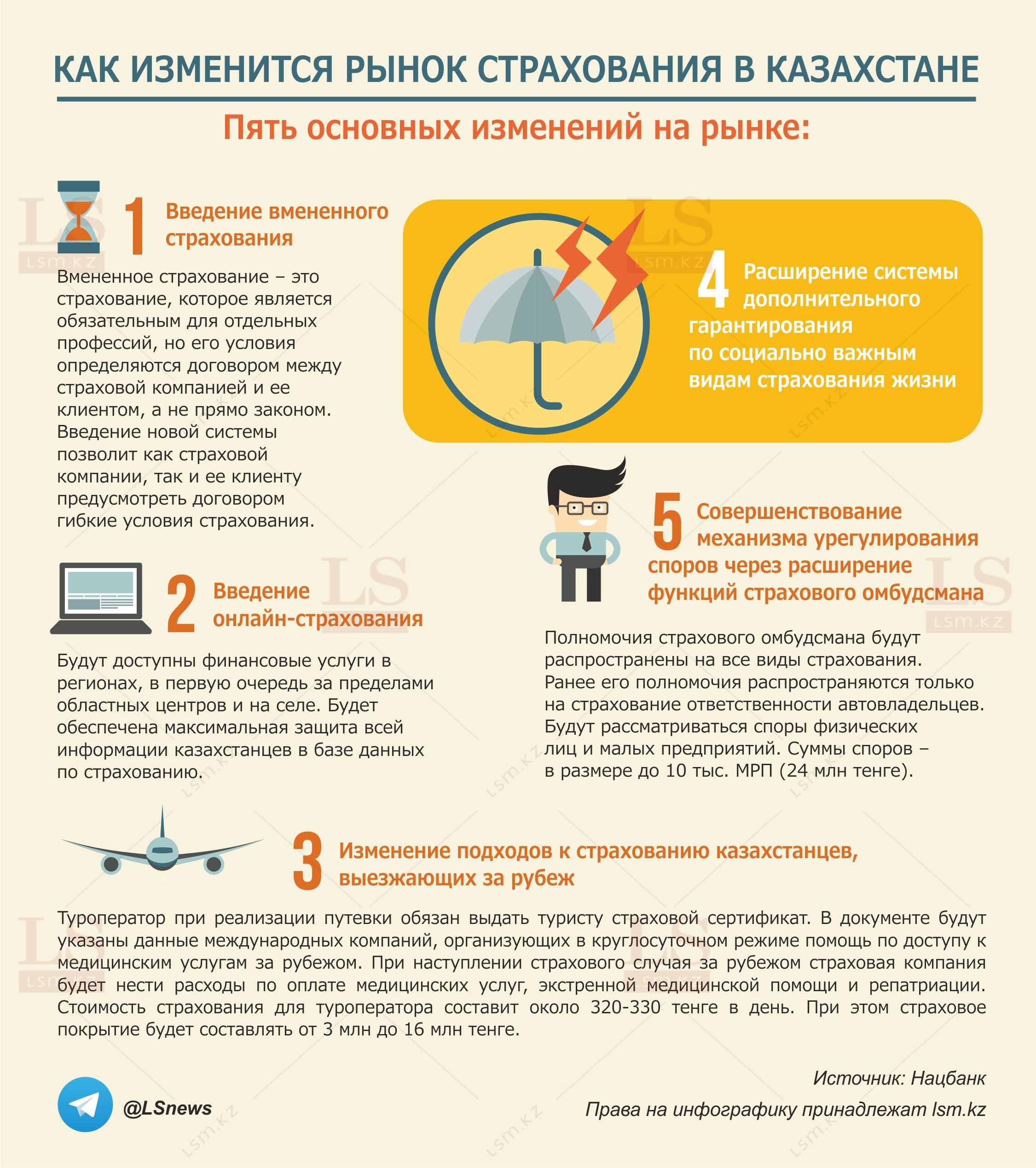 В начале июля президент Нурсултан Назарбаев подписал Закон "О внесении изменений по вопросам страхования и страховой деятельности, а также рынка ценных бумаг". LS подготовил инфографику о том, какие изменения вводятся в данном секторе.