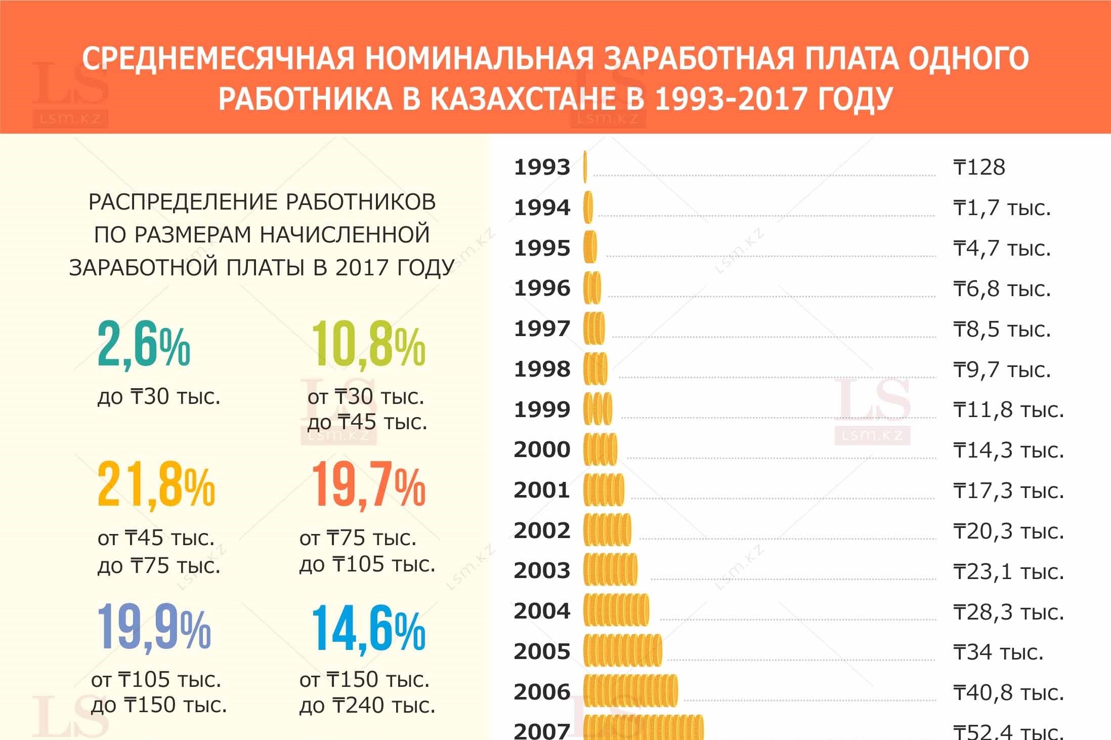 Редакция LS решила выяснить, как менялась средняя номинальная зарплата одного работника в Казахстане за годы независимости.
