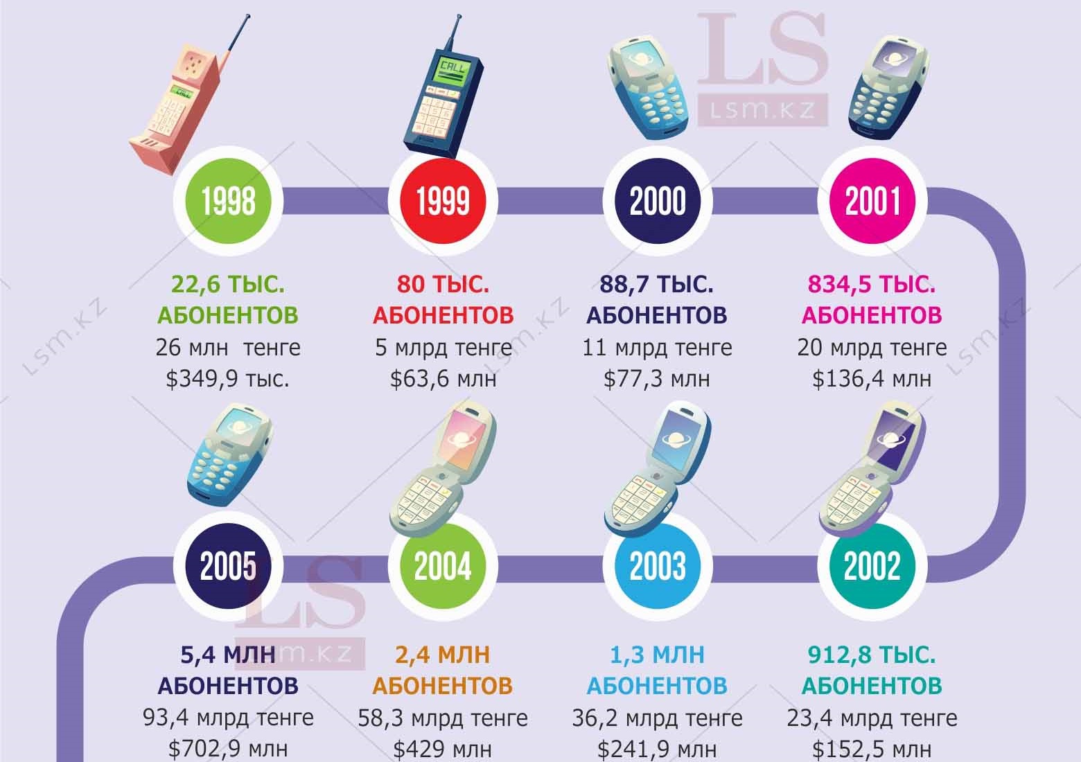 Статистику по сотовым телефонам в Казахстане начали вести с 1997 года. В этот год обладателями технической новинки были 11,2 тыс. человек. Однако выручку сотовых операторов удалось выяснить только в 1998 году. Тогда рынок мобильных услуг составил сразу 26 млн тенге, что в пересчете на среднегодовой курс доллара составил примерно $350 тыс.