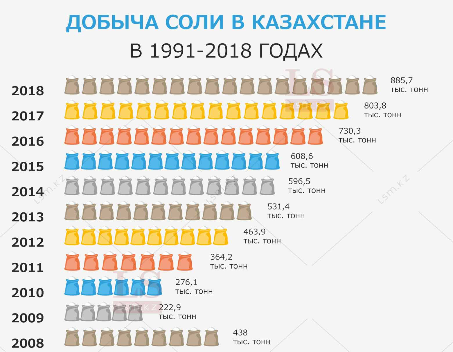 С 2010 года отрасль уже не снижала добычу и в 2018 году было получено 885,7 тыс. тонн соли.
