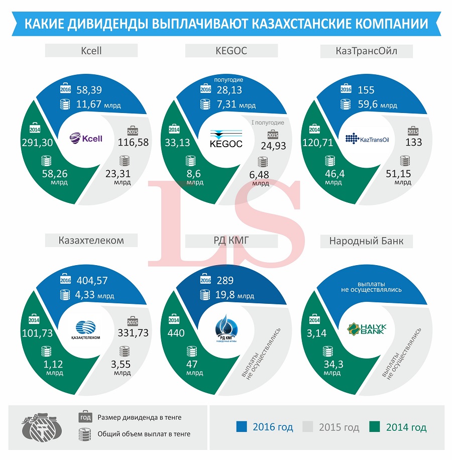 Крупнейшие компании, чьи акции торгуются на Казахстанской фондовой бирже, объявили размеры дивидендов по итогам деятельности за 2016 год. LS подготовил инфографику о том, как менялись выплаты акционерам за последние три года.