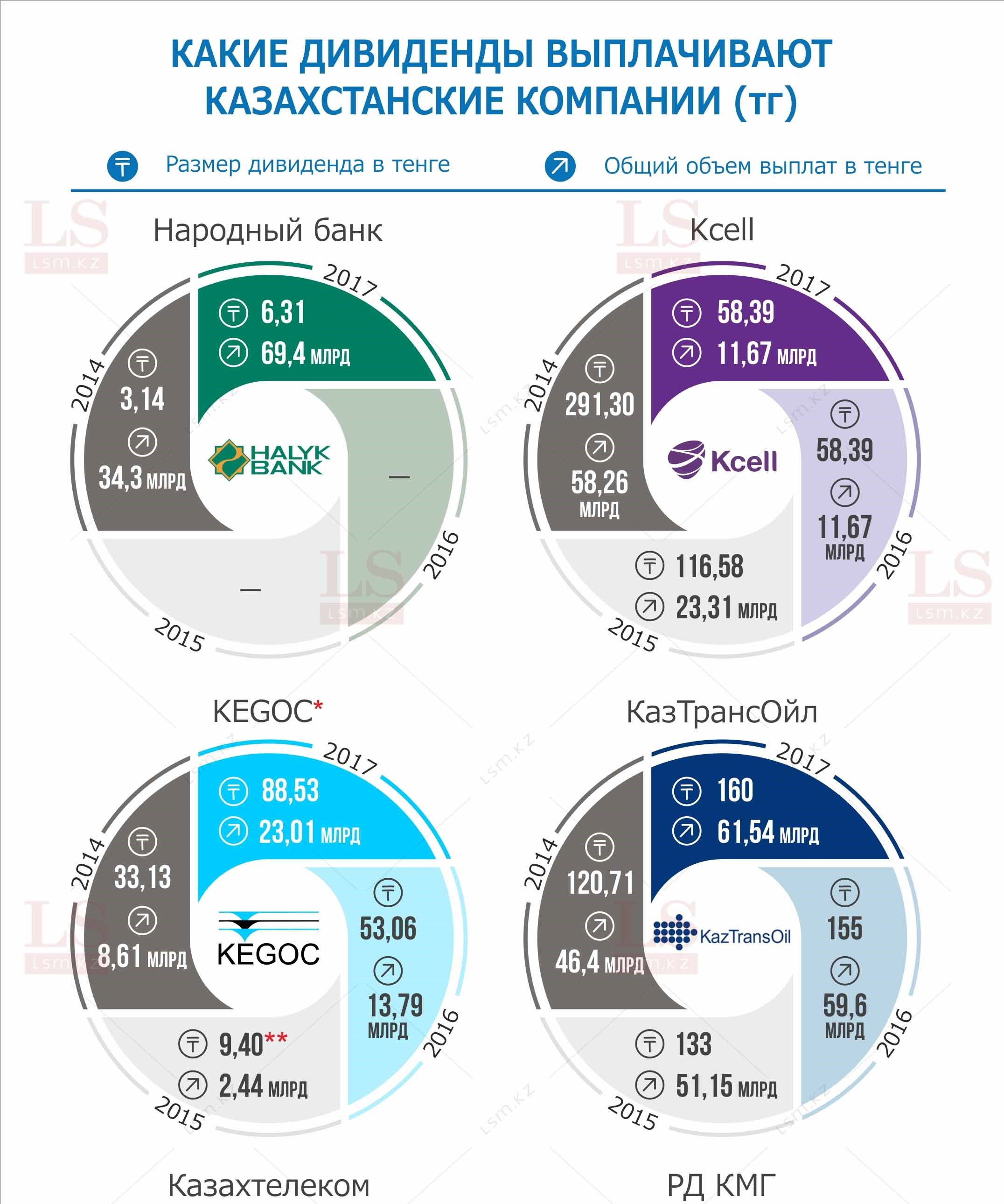 Крупнейшие компании, чьи акции торгуются на Казахстанской фондовой бирже, объявили размеры дивидендов по итогам деятельности за 2017 год. LS подготовил инфографику о том, как менялись выплаты акционерам в последние годы.