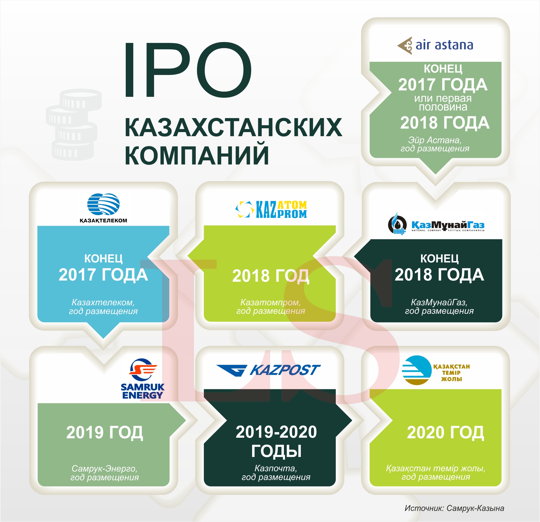 IPO "Қазақстан темір жолы" запланировано на самый поздний срок – 2020 год – после проведения мероприятий по финансовому оздоровлению. Целевая доля для реализации на фондовом рынке может колебаться в диапазоне 25-49% акций.