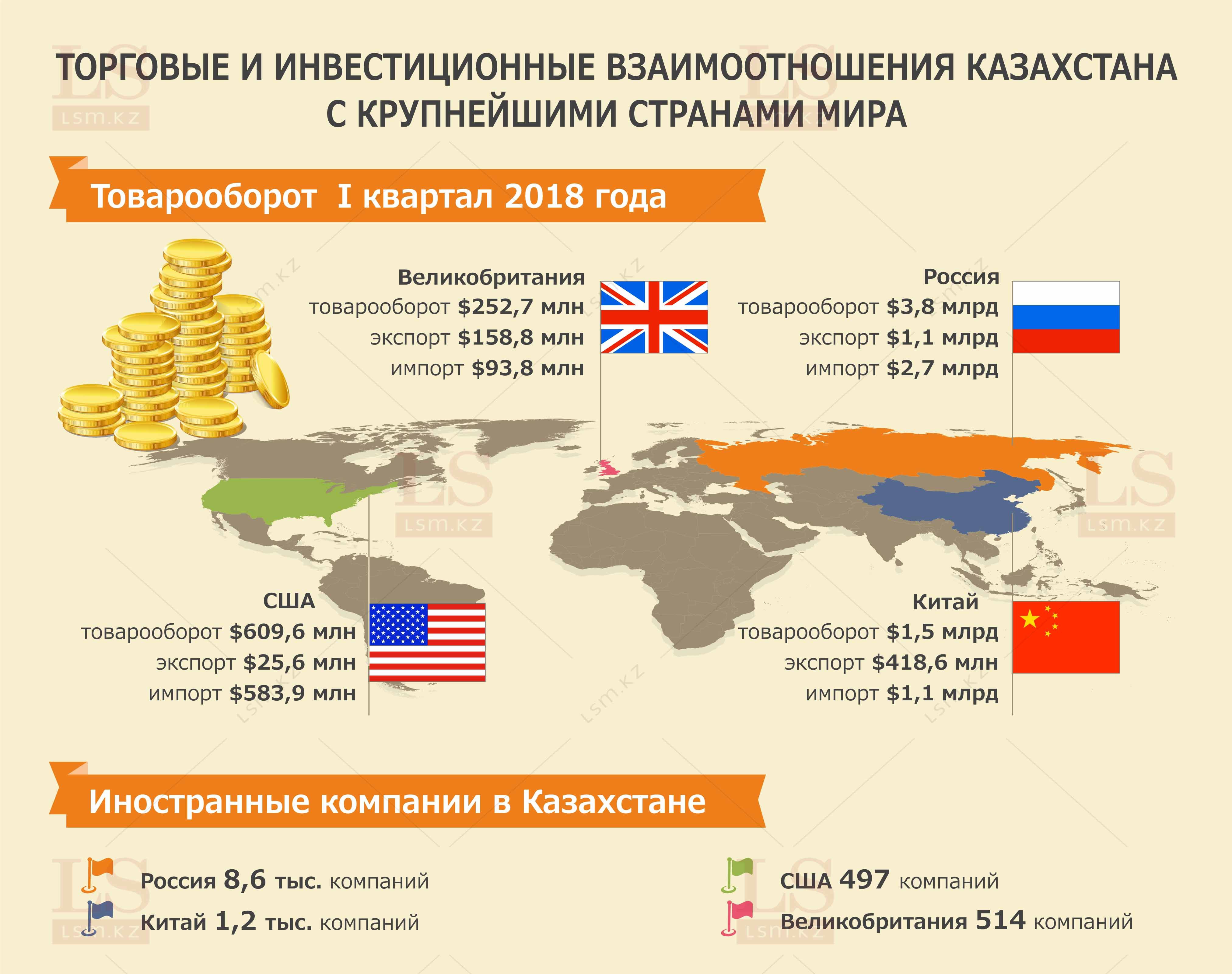В I квартале 2018 года Казахстан наторговал с Россией на $3,8 млрд, Китаем - $1,5 млрд тенге, Великобританией - $252,7 млн, а с США на $609,6 млн, передает LS.