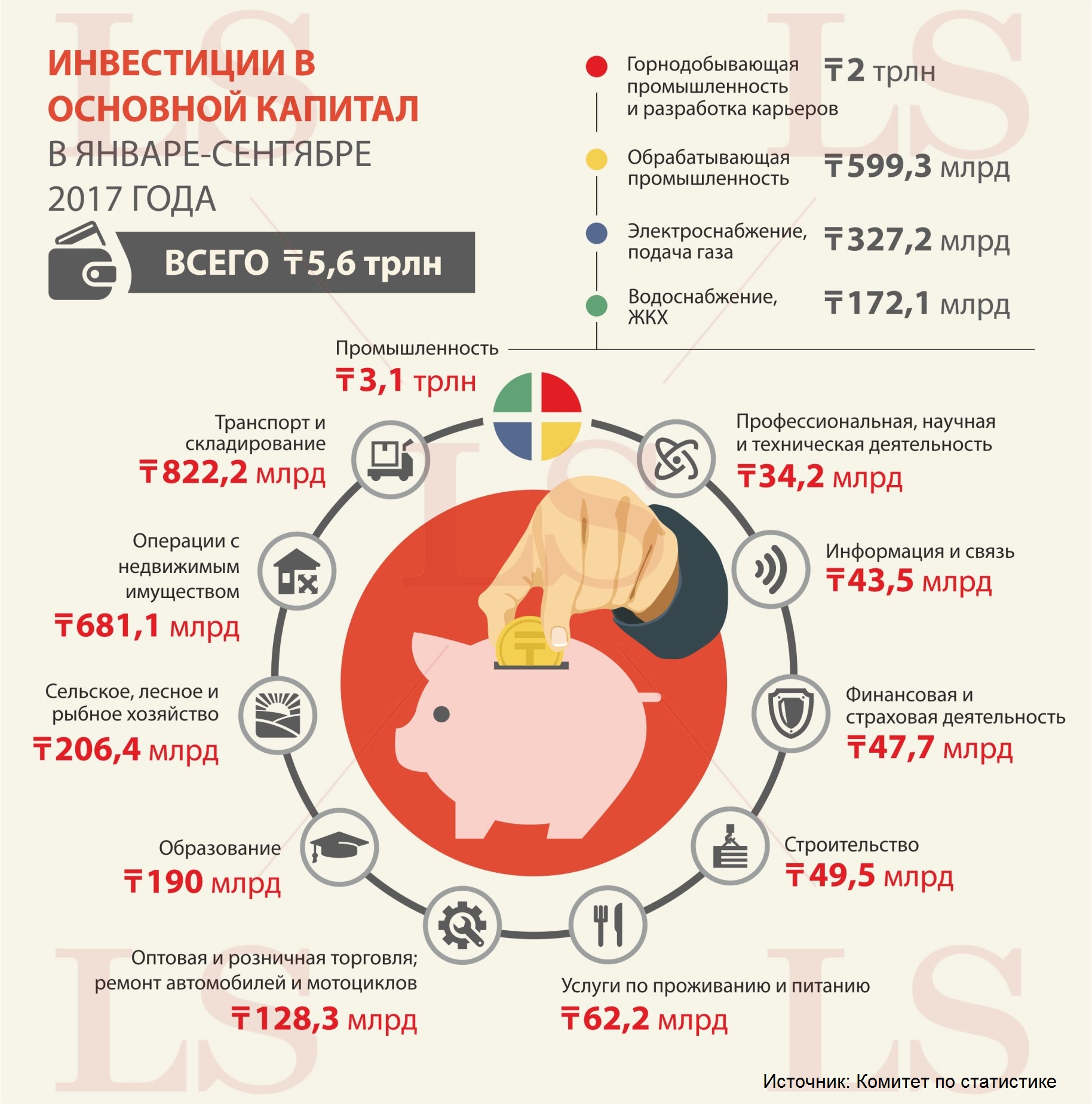 Инвестиции в основной капитал в январе-сентябре 2017 года составили 5,6 трлн тенге, передает LS.