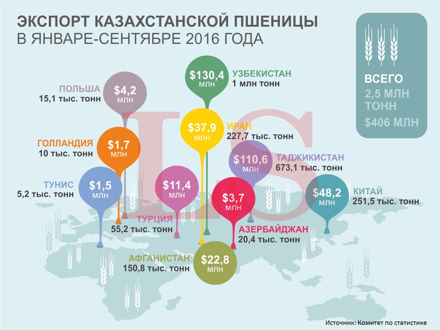 Самым крупным импортером зерна является Узбекистан, который за девять месяцев скупил 1 млн тонн на $130,4 млн. В Таджикистан было поставлено 673,1 тыс. тонн сельхозкультуры, в Иран - 227,7 тыс. тонн, а в Китай - 251,5 тыс. тонн.