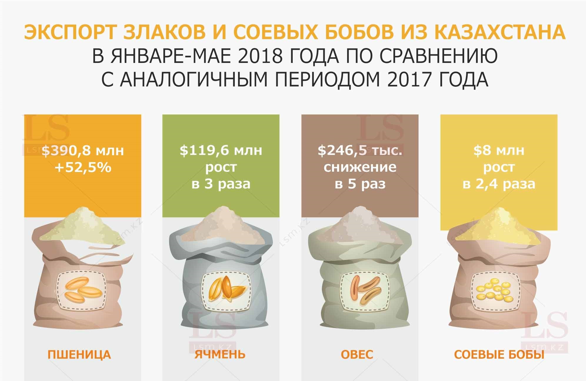 Согласно данным комитета по статистике и комитета гоcдоходов, Казахстан увеличил экспорт пшеницы в январе-мае 2018 года более чем в 1,5 раза по сравнению с аналогичным периодом 2017 года. Среди лидеров роста оказались Турция, Италия, Афганистан и Узбекистан.
