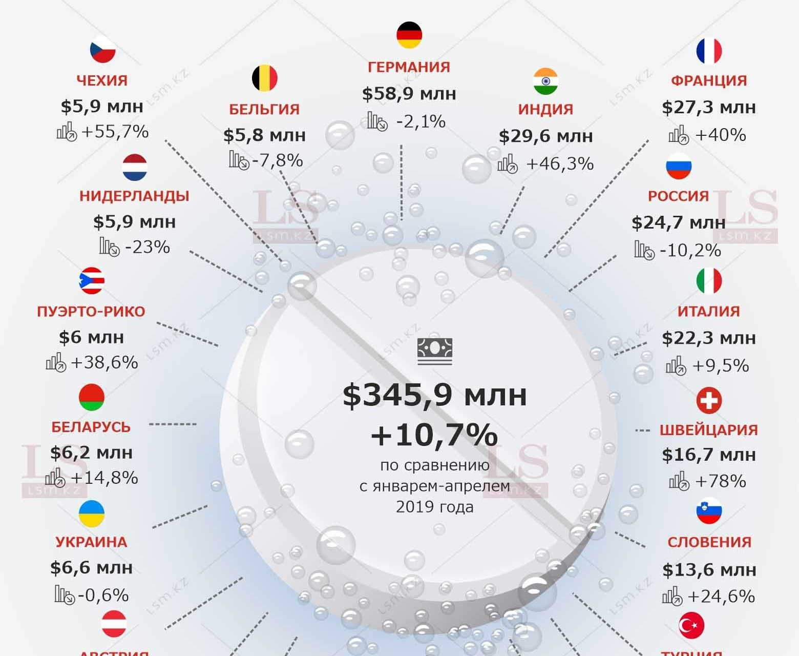 Казахстан стал закупать все больше лекарств за рубежом. LS показывает в инфографике, из каких стран везут фармацевтическую продукцию.