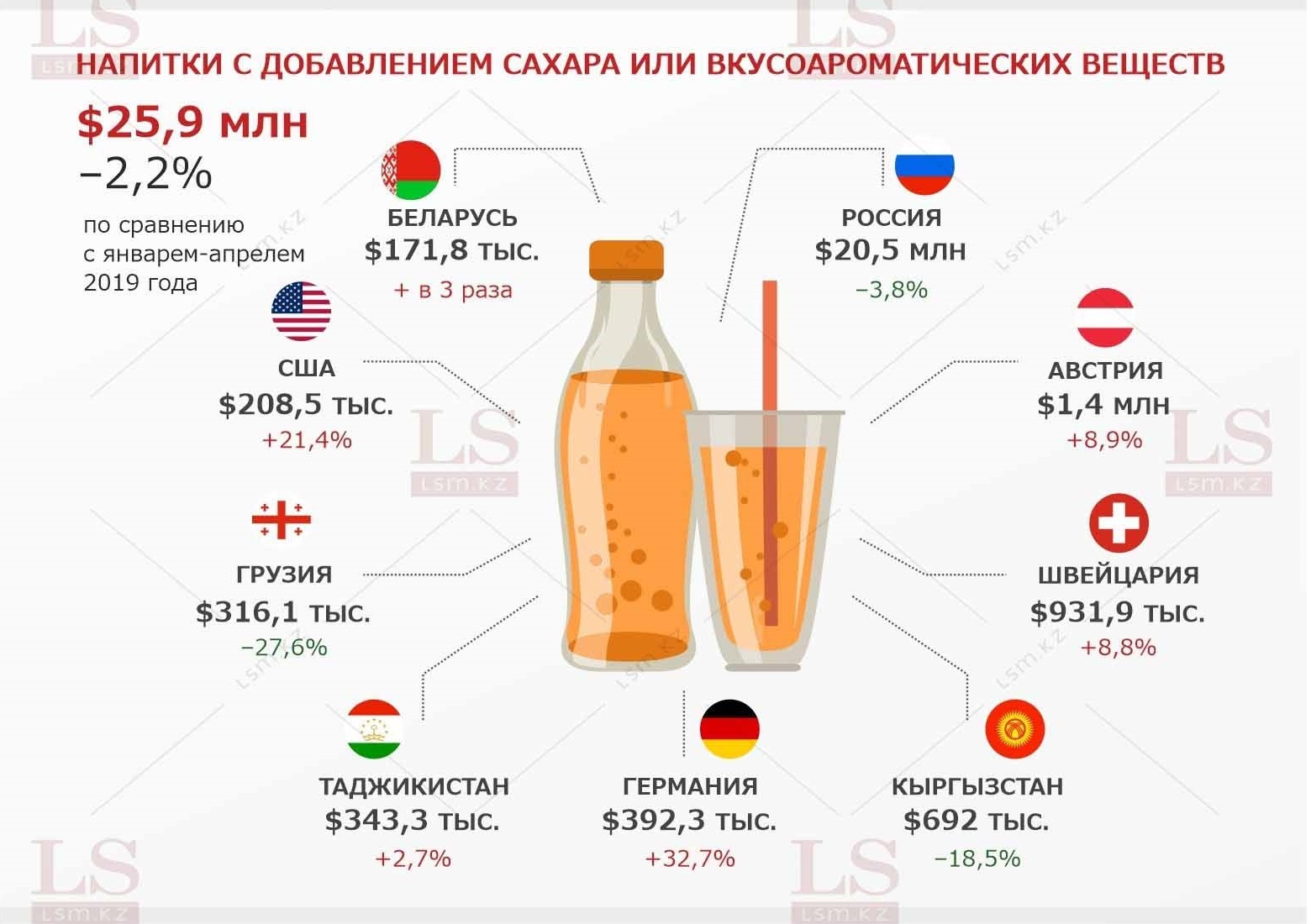 Помимо этого, Казахстан покупает фруктовые и овощные соки из России, Узбекистана, Ирландии, Китая, Франции, Израиля и других стран.
