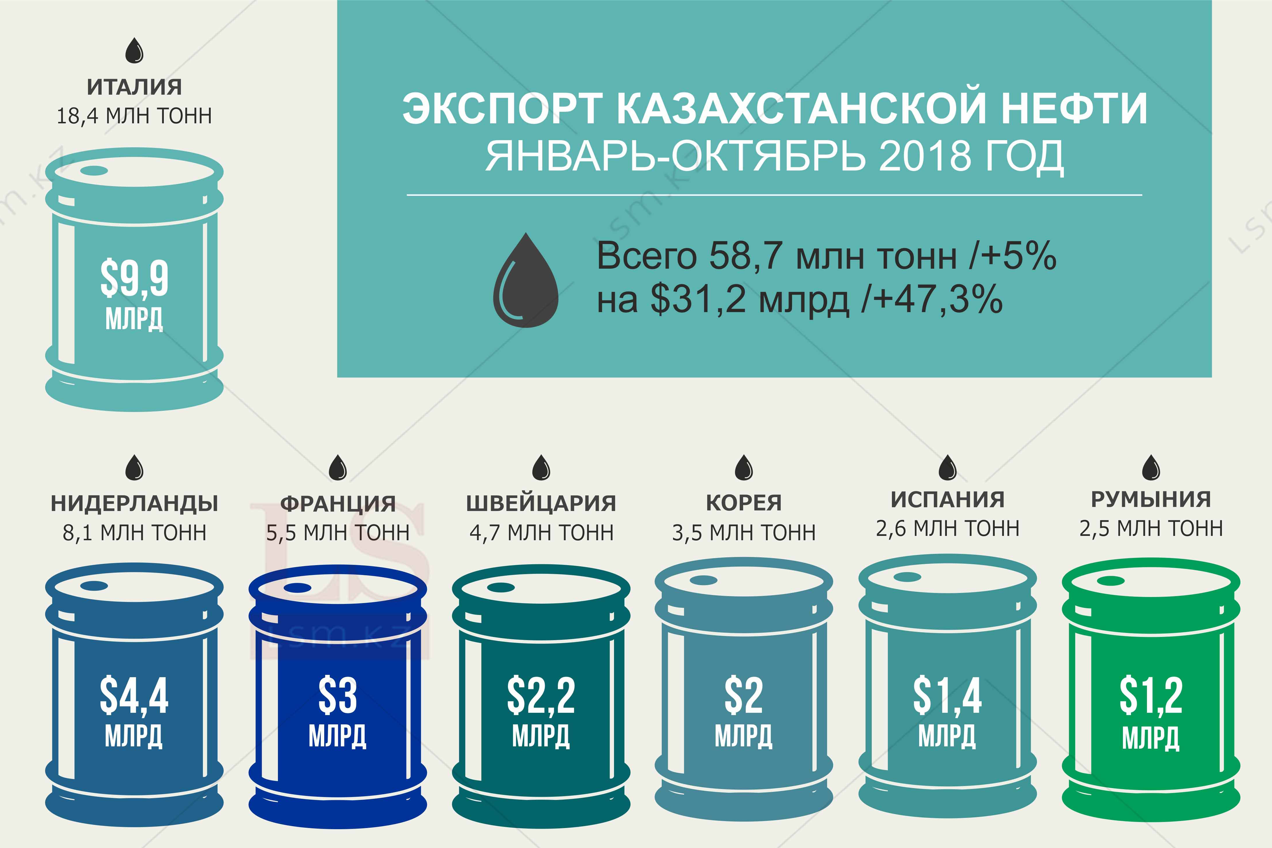 В январе-октябре 2018 года казахстанский экспорт нефти достиг $31,2 млрд, передает LS.