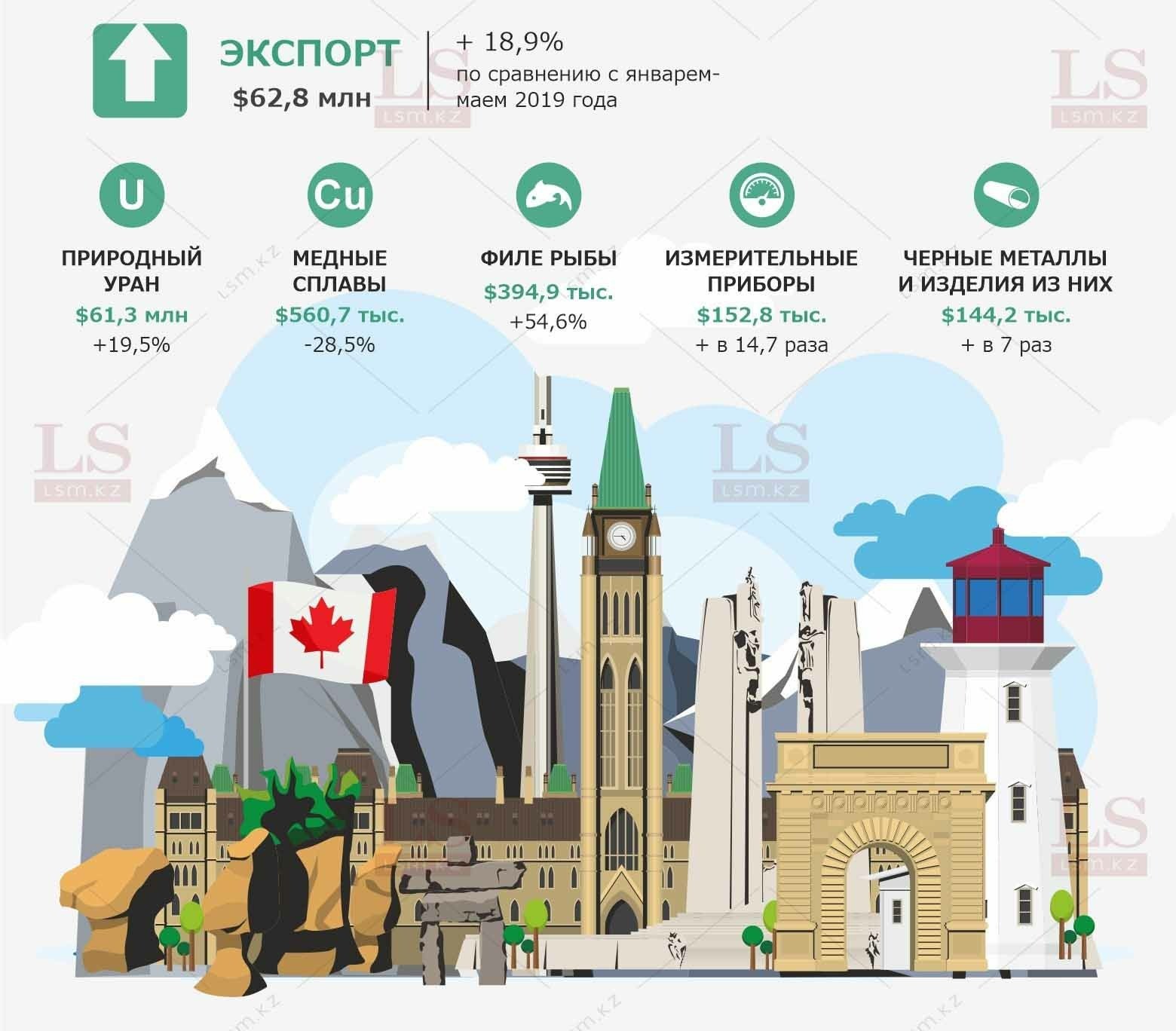 Казахстан наращивает экспорт в Канаду, а импорт, напротив, уменьшает. LS показывает инфографику о товарах, которые две страны поставляют друг другу.