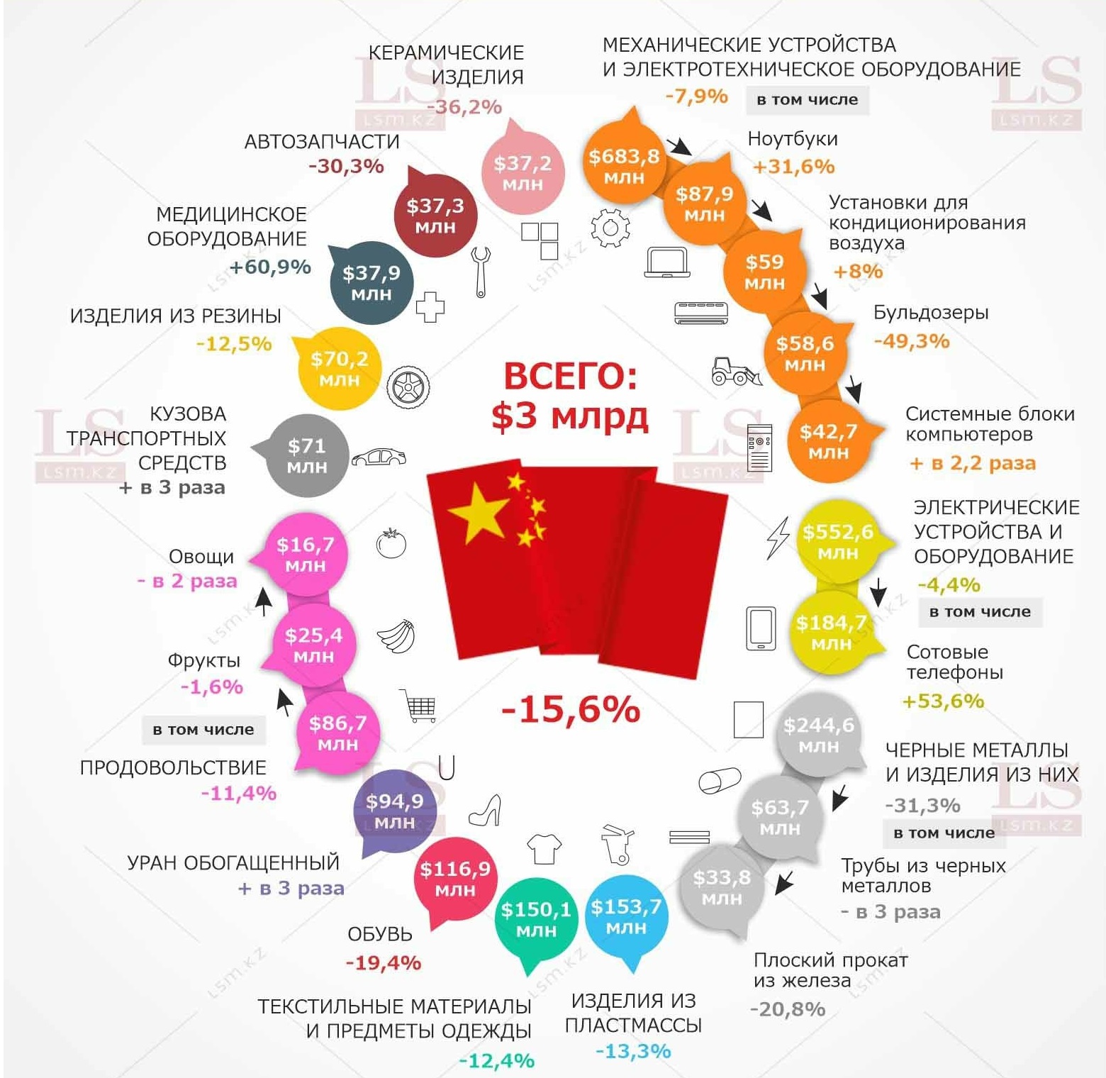 Казахстан увеличил поставки ноутбуков, компьютеров и сотовых телефонов из Китая. LS показывает инфографику о том, какие еще товары импортируются в страну из Поднебесной.