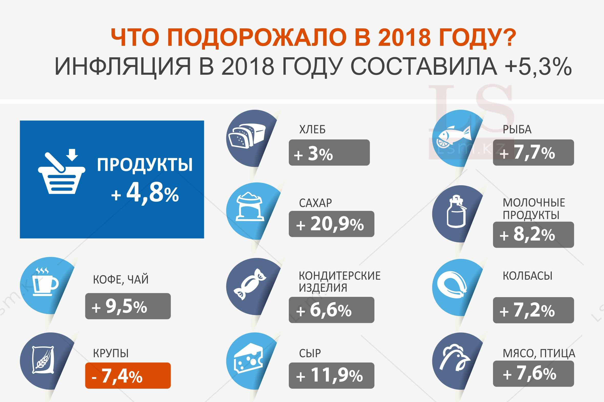 В 2018 году инфляция составила 5,3%. В том числе в декабре 2018 года в сравнении с декабрем 2017 года продукты подорожали на 4,8%, непродовольственные товары – на 6,4%, а услуги сферы ЖКХ – на 3,2%, передает LS.