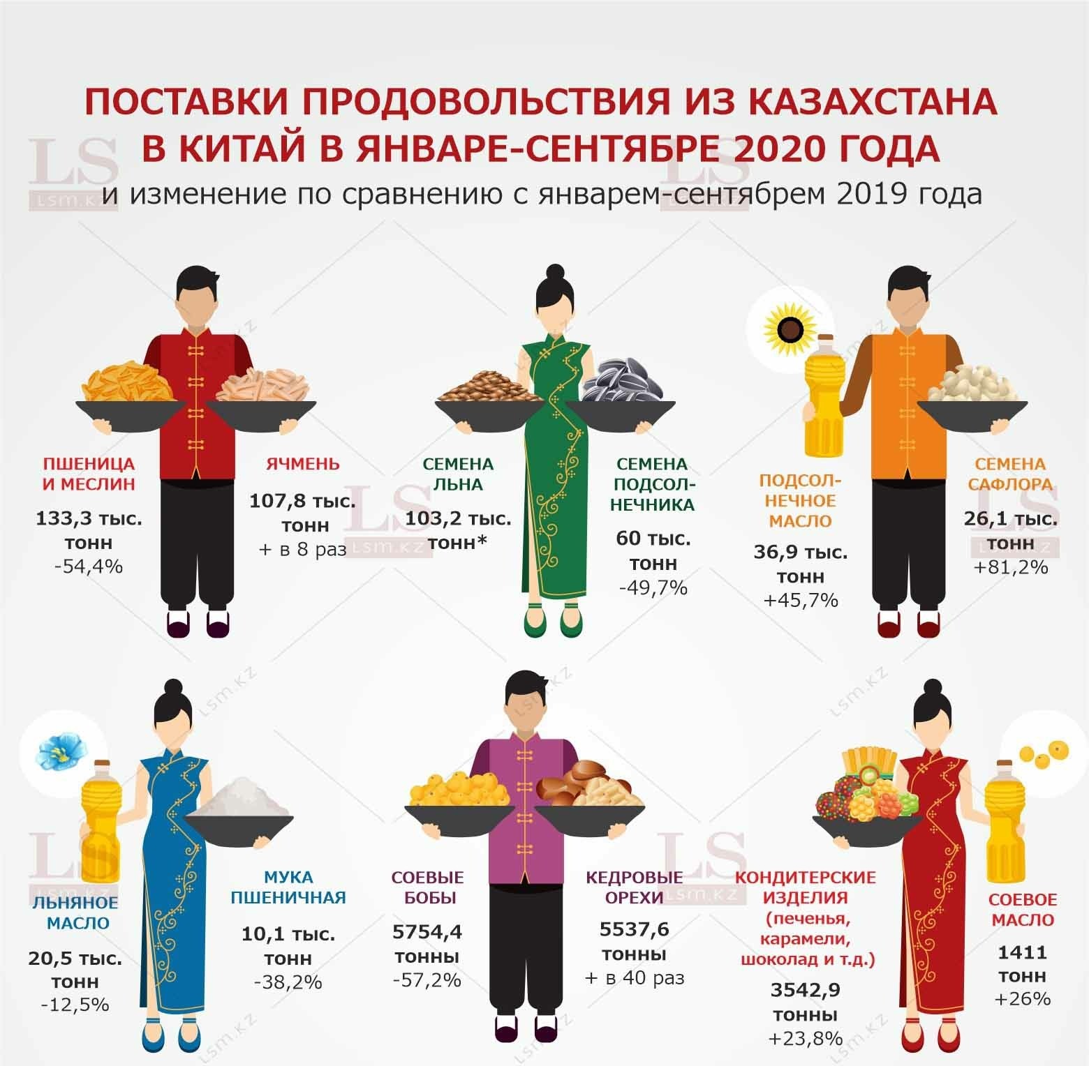 В инфографике представлена подробная информация об объемах продовольствия, поставленных из Казахстана в Китай за девять месяцев 2020 года, а также изменениях по сравнению с аналогичным периодом 2019 года.