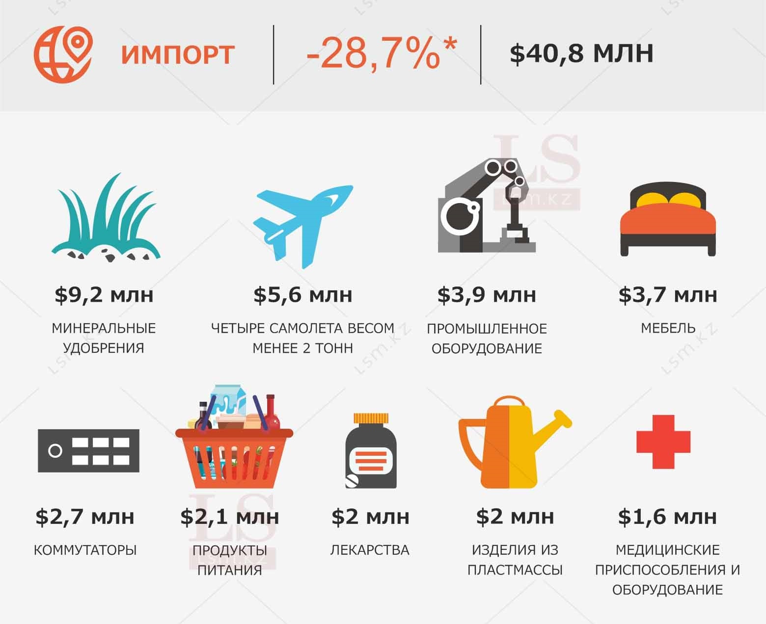 В свою очередь импорт за отчетный период составил $40,8 млн. Поставки включают минеральные удобрения, самолеты, промышленное оборудование, мебель, продукты питания, лекарства, медицинское оборудование и другие.