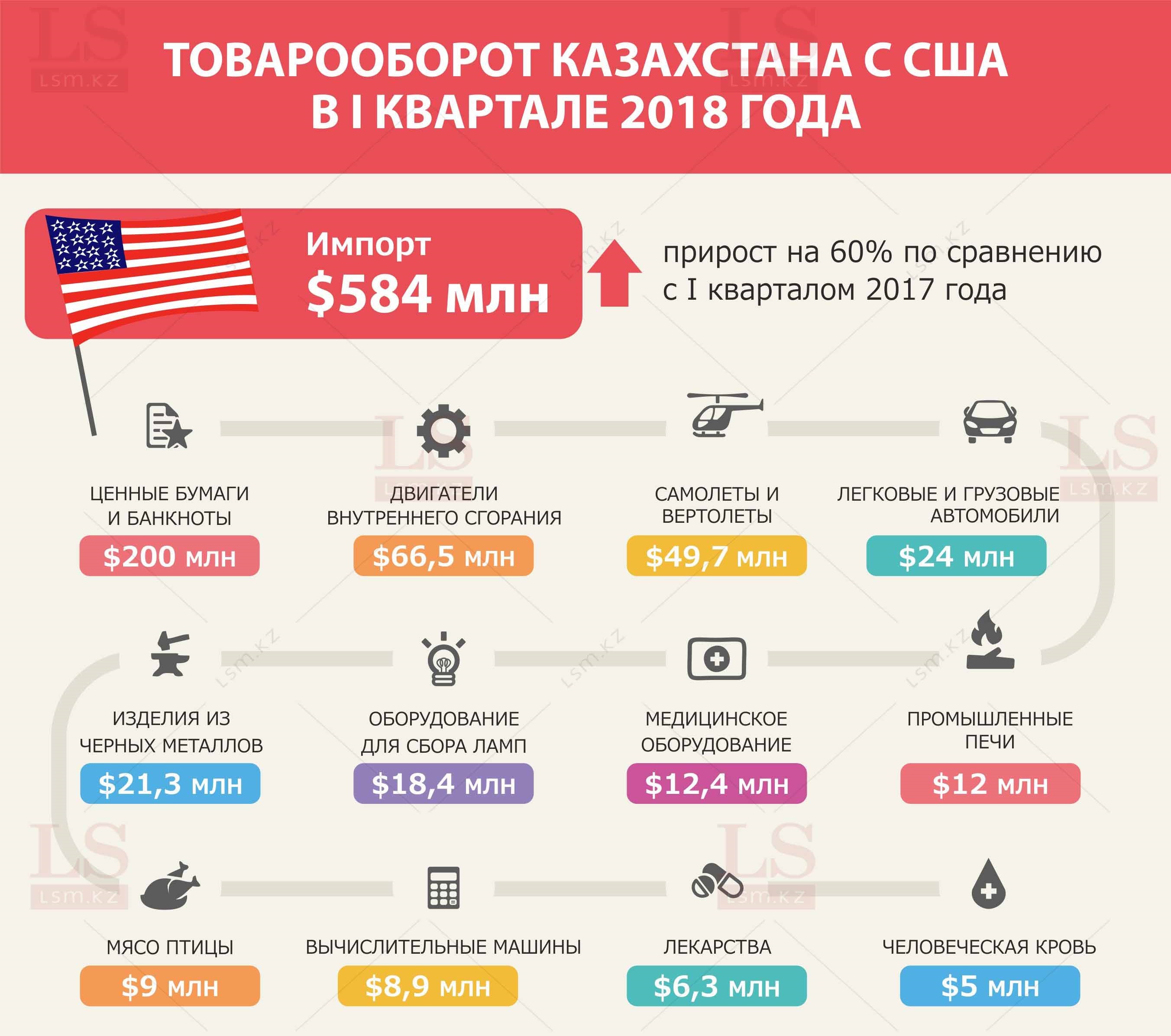 Больше всего Казахстан приобрел в Америке ценные бумаги и банкноты на $200 млн. Также двигатели внутреннего сгорания, летательные аппараты, автомобили, медицинское и промышленное оборудование. Помимо этого, в перечень товаров из США вошли лекарства, мясо птицы и человеческая кровь. Объем закупок человеческой крови в I квартале 2018 года оказался на уровне $5 млн.