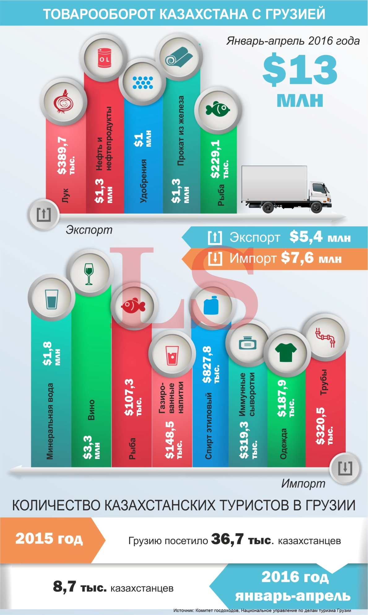 В январе-апреле 2016 года товарооборот между Казахстаном и Грузией составил $13 млн, передает LS.
