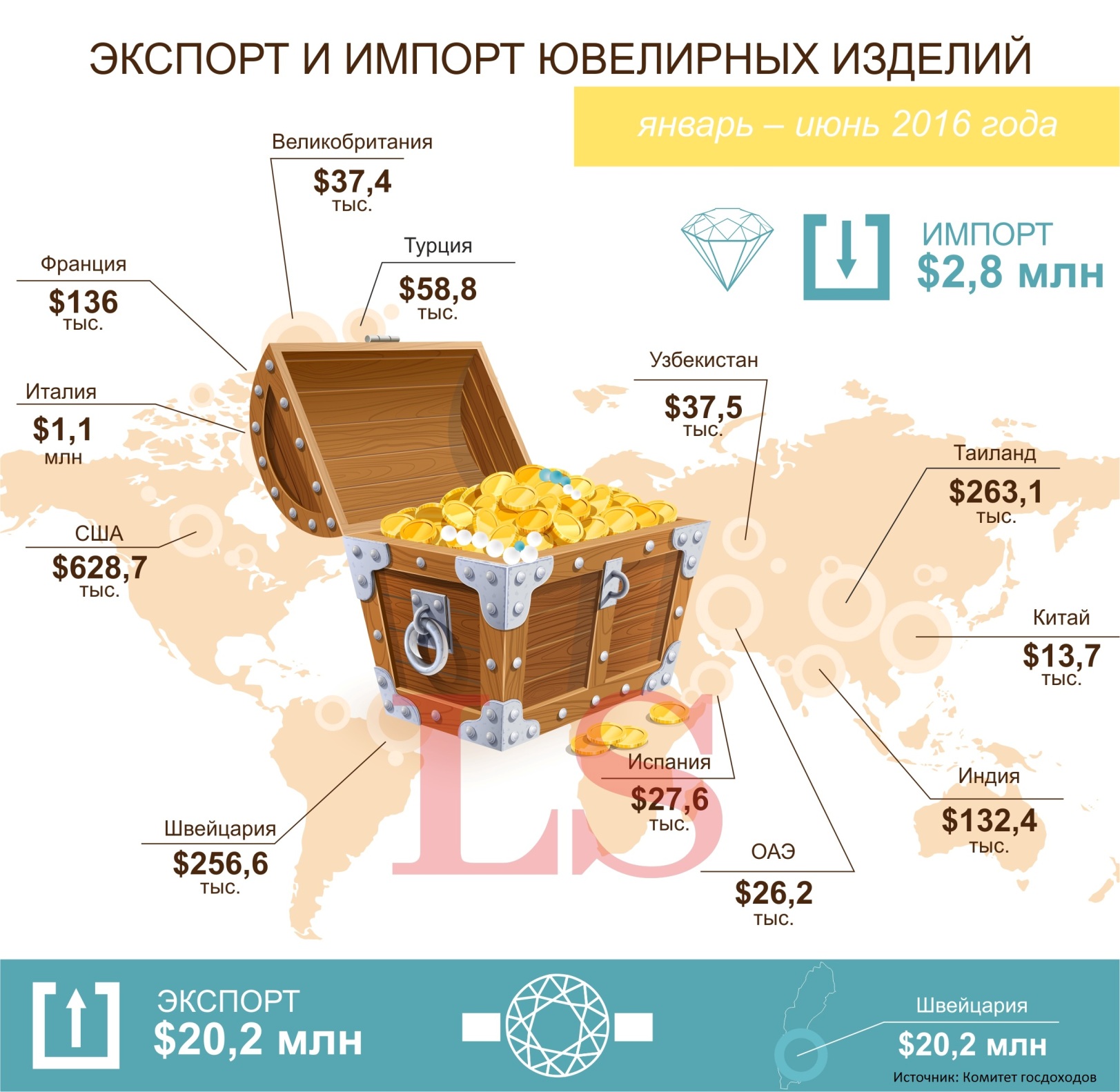 В свою очередь Казахстан в первом полугодии продал ювелирных украшений из золота и серебра на $20,2 млн. Все поставки, а это меньше тонны, были произведены в одну страну - Швейцарию.