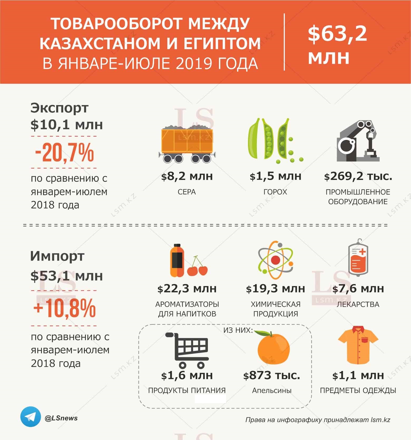 Экспорт Казахстана в Египет снижается в то время, как импорт увеличивается. LS представляет инфографику о товарообороте между странами.