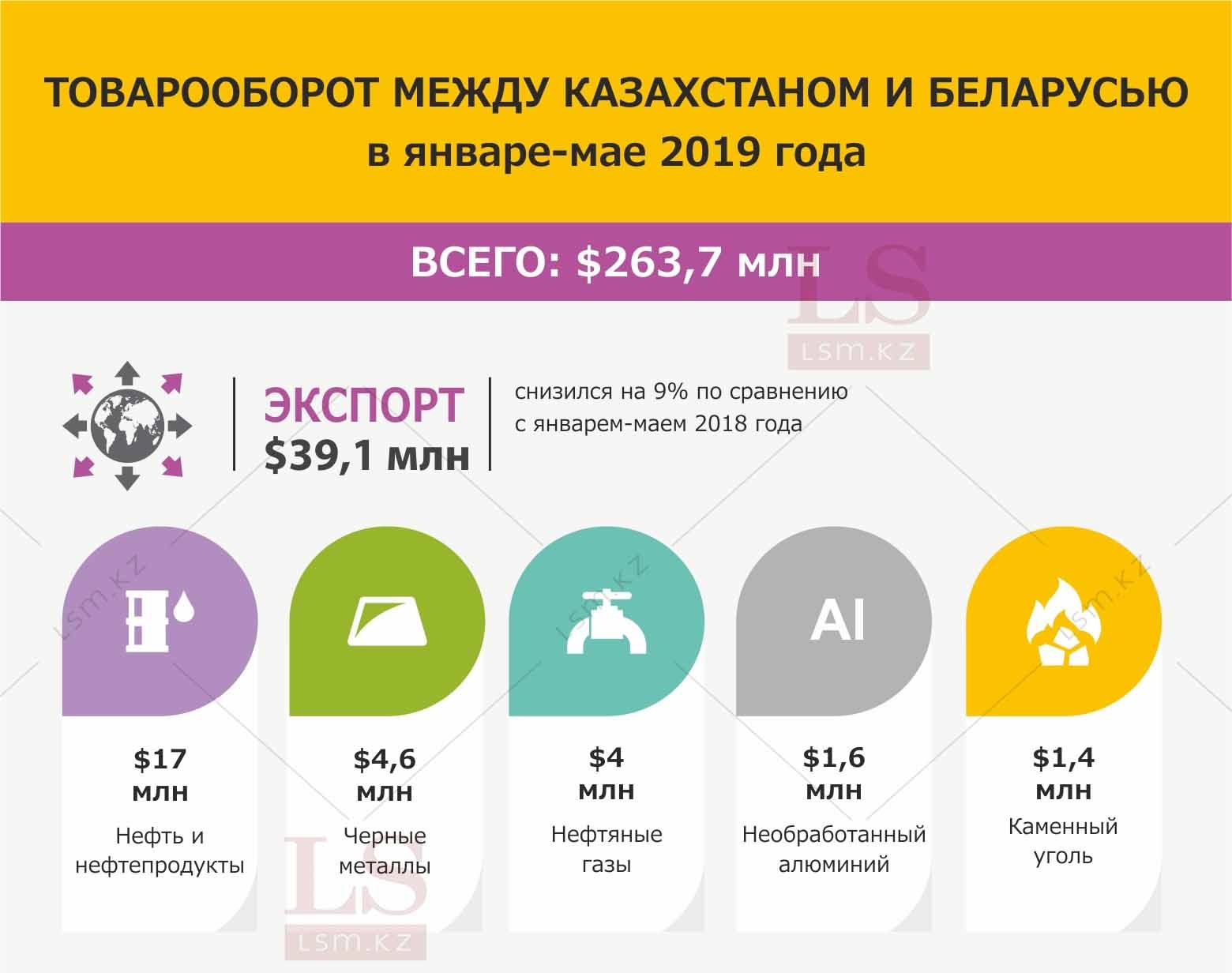 Экспорт Казахстана в Беларусь за пять месяцев 2019 года превысил $39 млн и состоял преимущественно из сырья: нефти, нефтепродуктов, черных металлов, угля и необработанного алюминия.