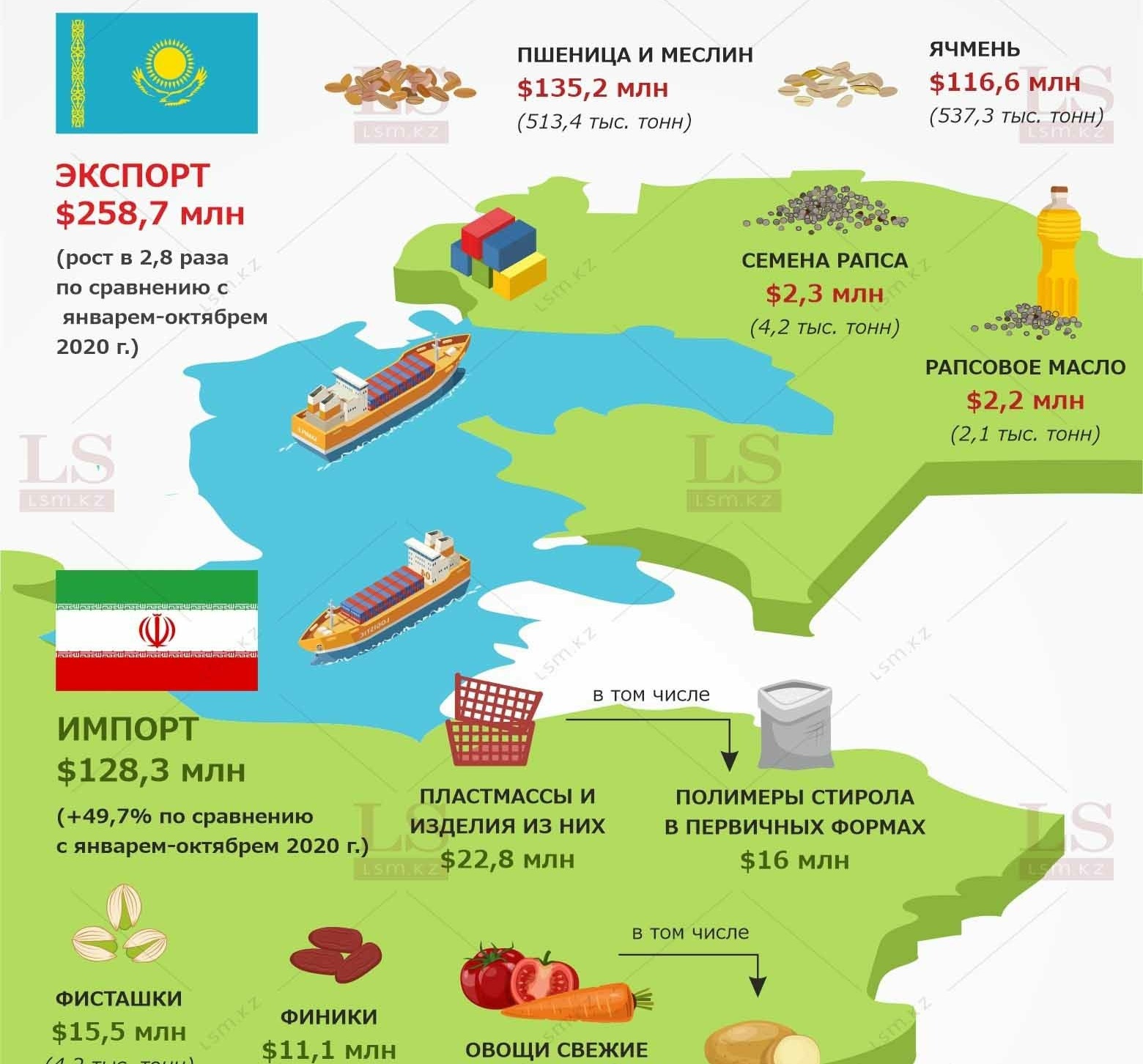 В то же время импорт из Ирана вырос почти на 50% и превысил $128 млн. Оттуда в Казахстан привезли пластмассы, фисташки, финики, овощи, фрукты, молочные продукты и т.д.