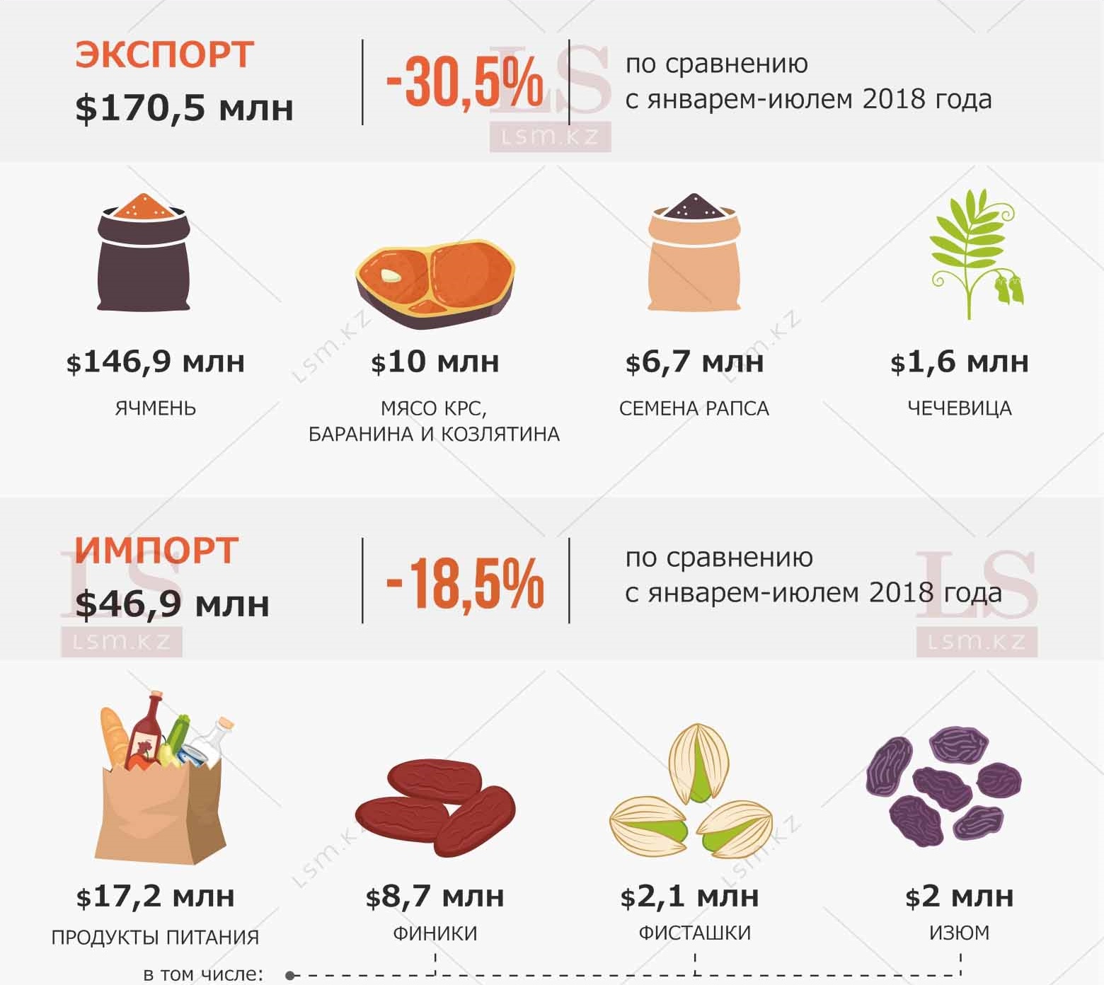 Значительную часть поставок в Иран занимает ячмень. Также Казахстан продает мясо крупного рогатого скота, баранину и козлятину, семена рапса и чечевицу.