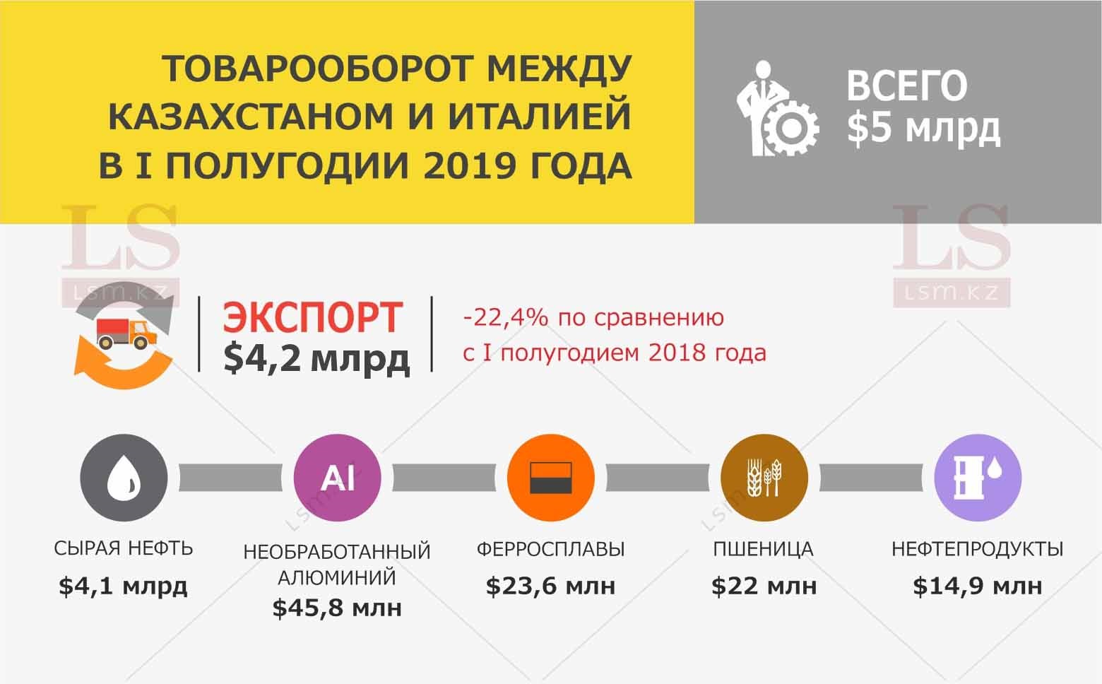 Объем торговли между Казахстаном и Италией за шесть месяцев 2019 года достиг $5 млрд. Из них экспорт составил $4,2 млрд, что на 22,4% меньше показателя аналогичного периода 2018 года.