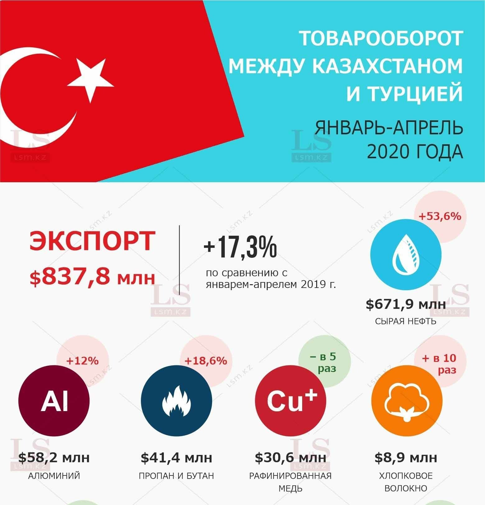 Экспорт Казахстана в Турцию в январе-апреле 2020 года вырос на 17,3% по сравнению с аналогичным периодом 2019 года и составил $837,8 млн. Увеличились поставки нефти, алюминия, хлопка, пропана и бутана. А снизились – меди, чечевицы и пшеницы.