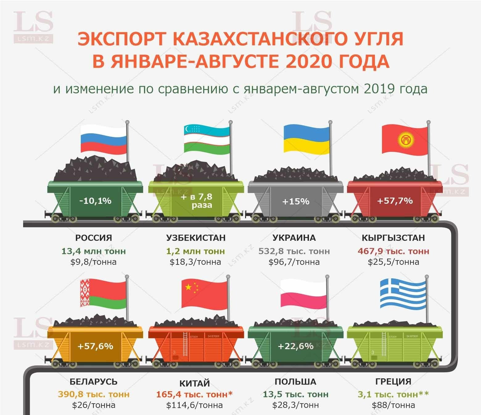Всего за январь-август 2020 года Казахстан поставил за рубеж 16,2 млн тонн каменного и бурого угля, что на 6,3% меньше, чем в аналогичном периоде 2019 года.