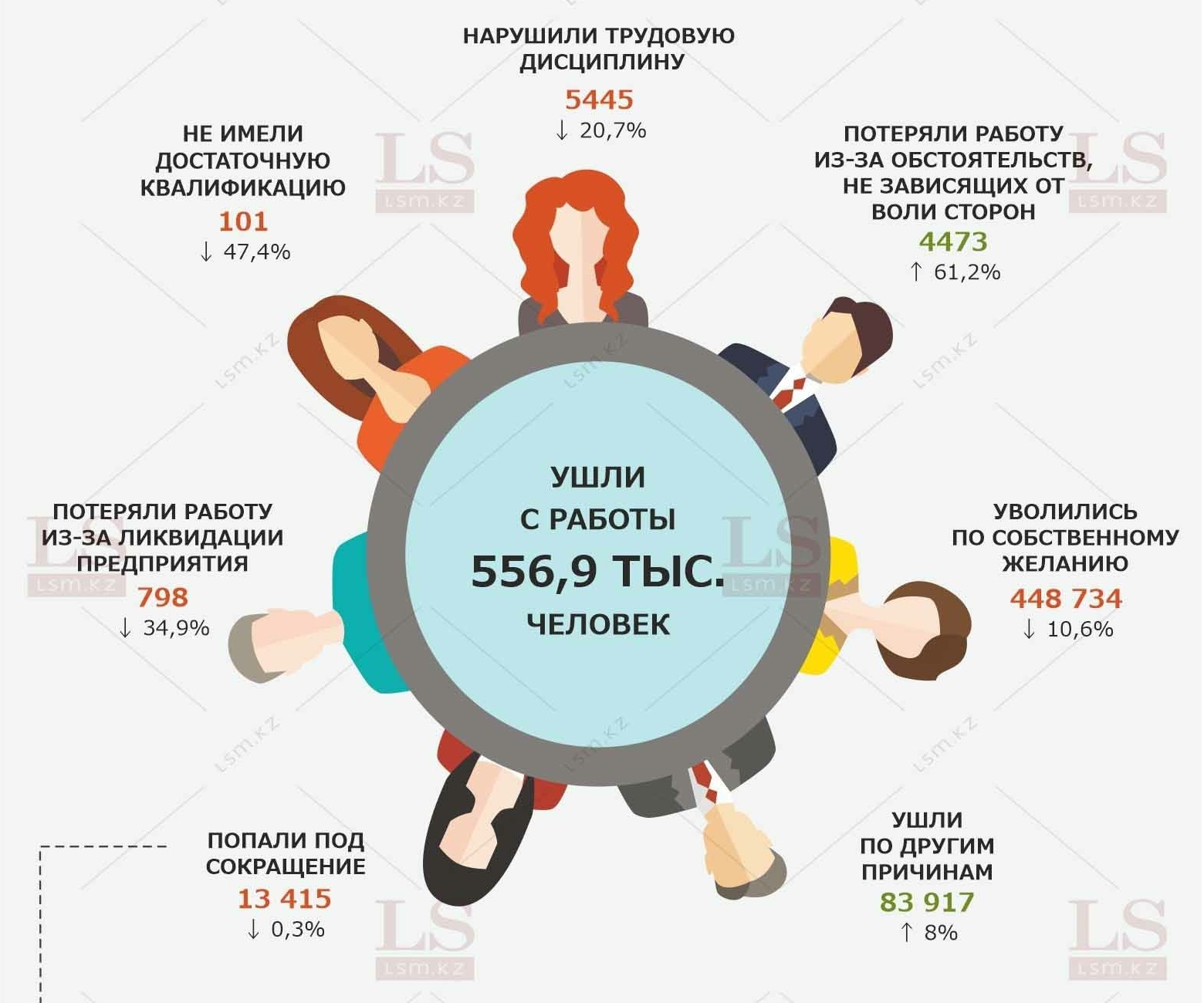 За девять месяцев 2020 года в Казахстане в средних и крупных предприятиях нашли работу 517,9 тыс. человек. Но ушли со своего места 556,9 тыс. LS показывает инфографику о причинах их увольнения и о том, какие отрасли данная ситуация затронула больше всего.