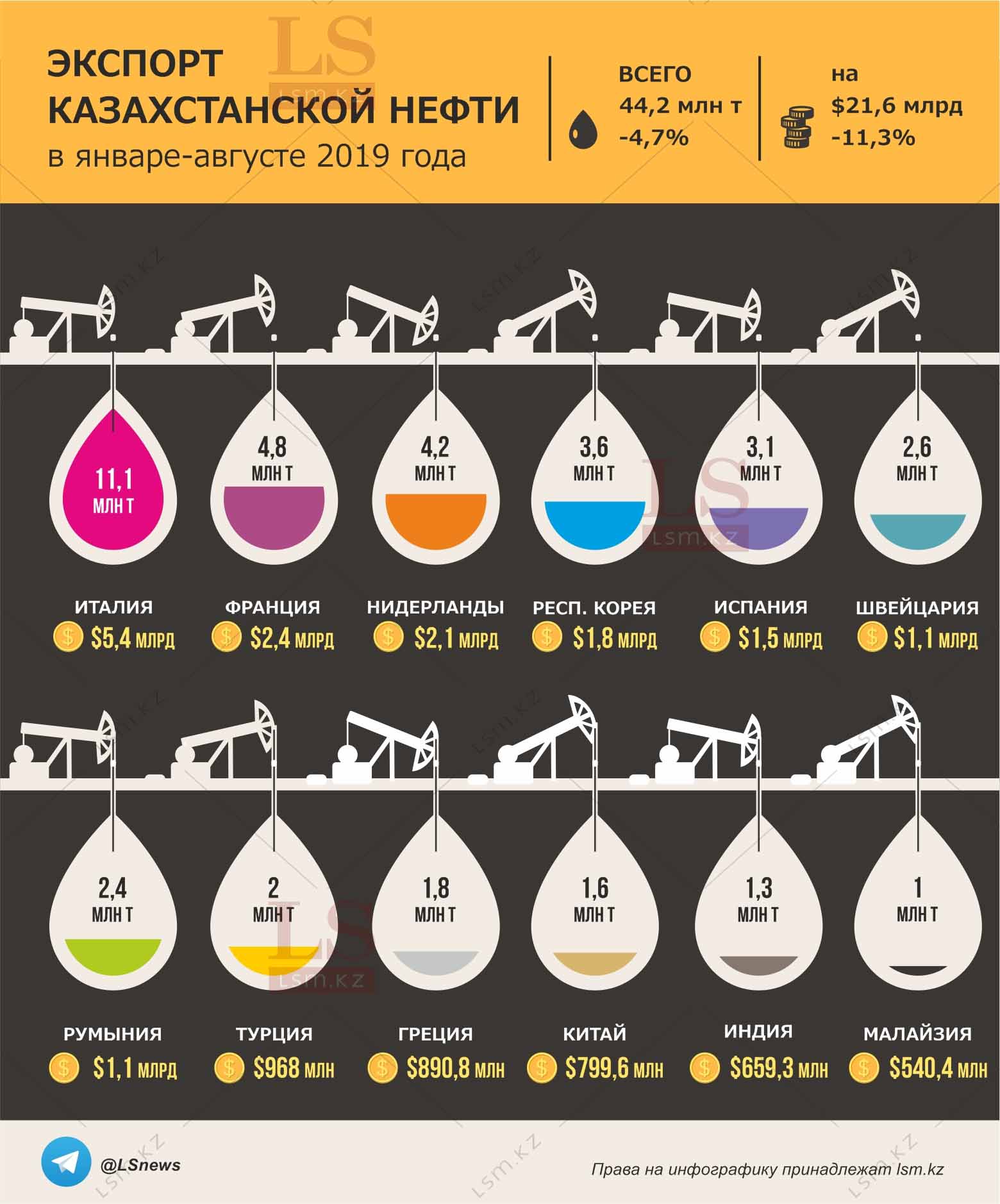 В январе-августе 2019 года Казахстан экспортировал 44,2 млн тонн нефти, что ниже аналогичного показателя восьми месяцев 2018 года на 4,7%, передает LS.