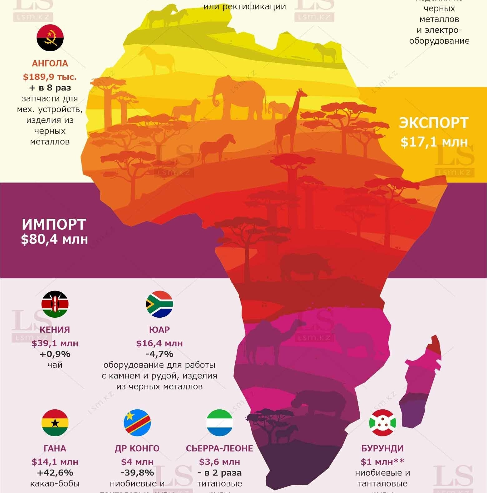 За восемь месяцев 2020 года Казахстан имел торговые отношения с 32 африканскими странами к югу от Сахары, десяти из них были экспортированы отечественные товары более чем на $17 млн.