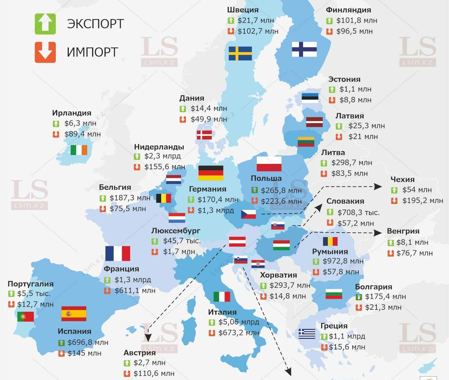 В инфографике представлена подробная информация об объемах товарооборота между Казахстаном и 27 государствами Европейского союза.
