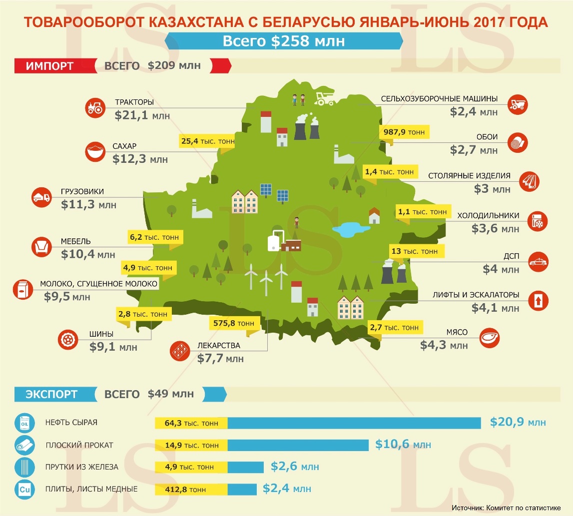 В январе-июне 2017 года товарооборот Казахстана с Беларусью составил $258 млн, передает LS.