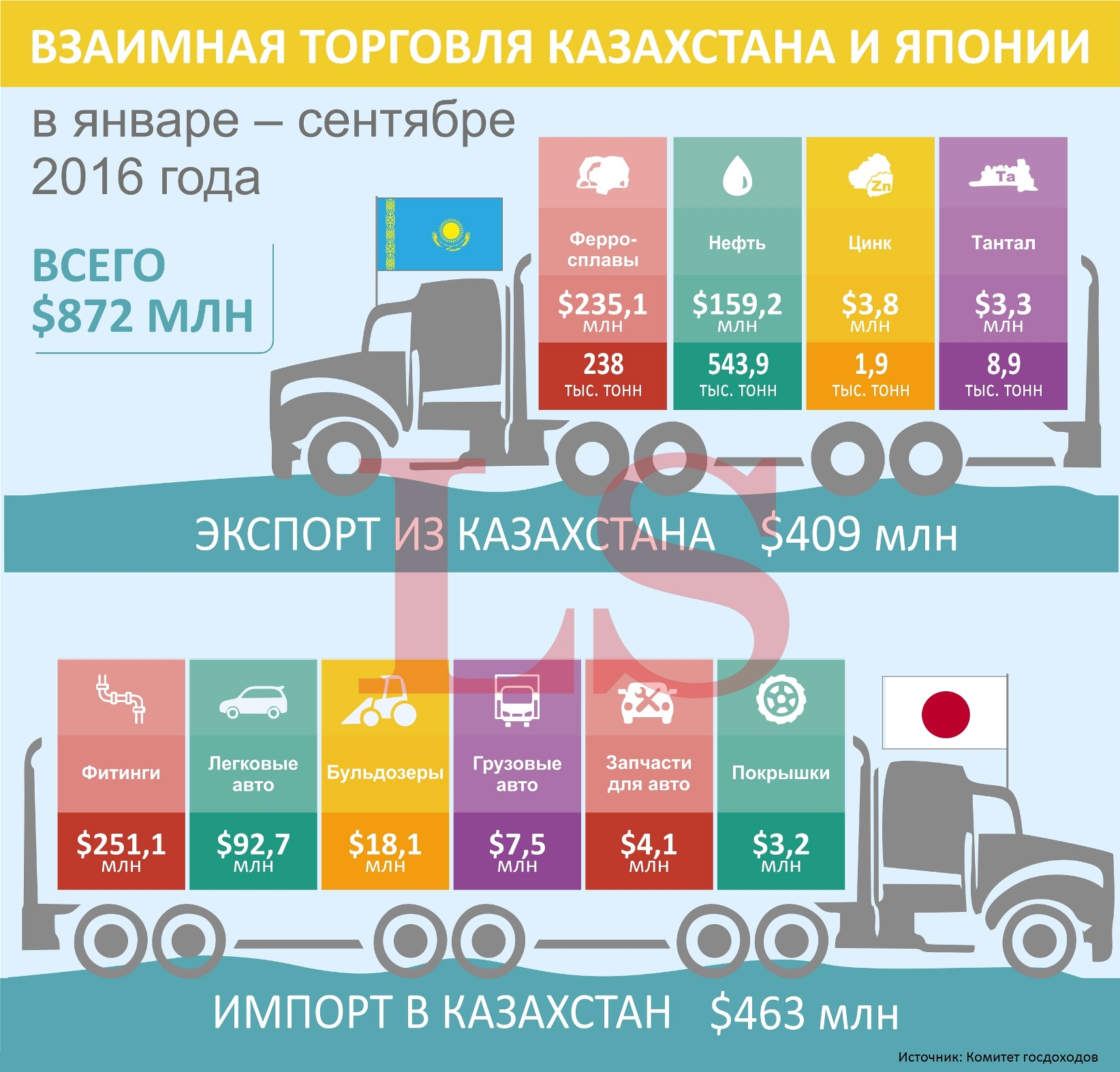 Товарооборот Казахстана с Японией в январе-сентябре 2016 года составил $872 млн, что на 10,1% меньше аналогичного показателя 2015 года ($970 млн), передает LS.