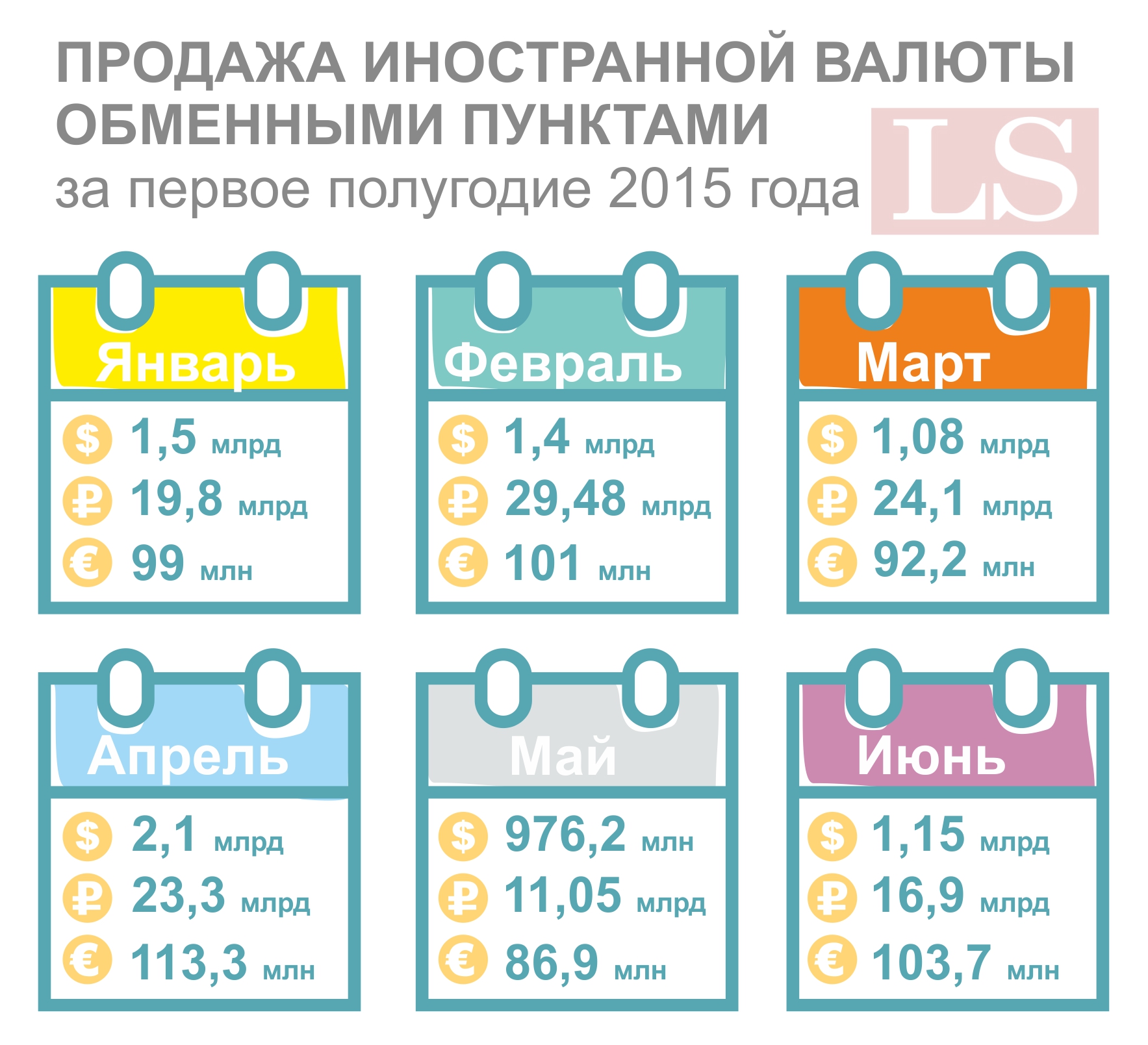 При этом пик продаж в первом полугодии 2015 года пришелся на апрель, в данный период обменными пунктами было реализовано $2,1 млрд. А уже в мае 2015-го продажа достигла рекордного минимума за последние несколько лет – $976,2 млн.