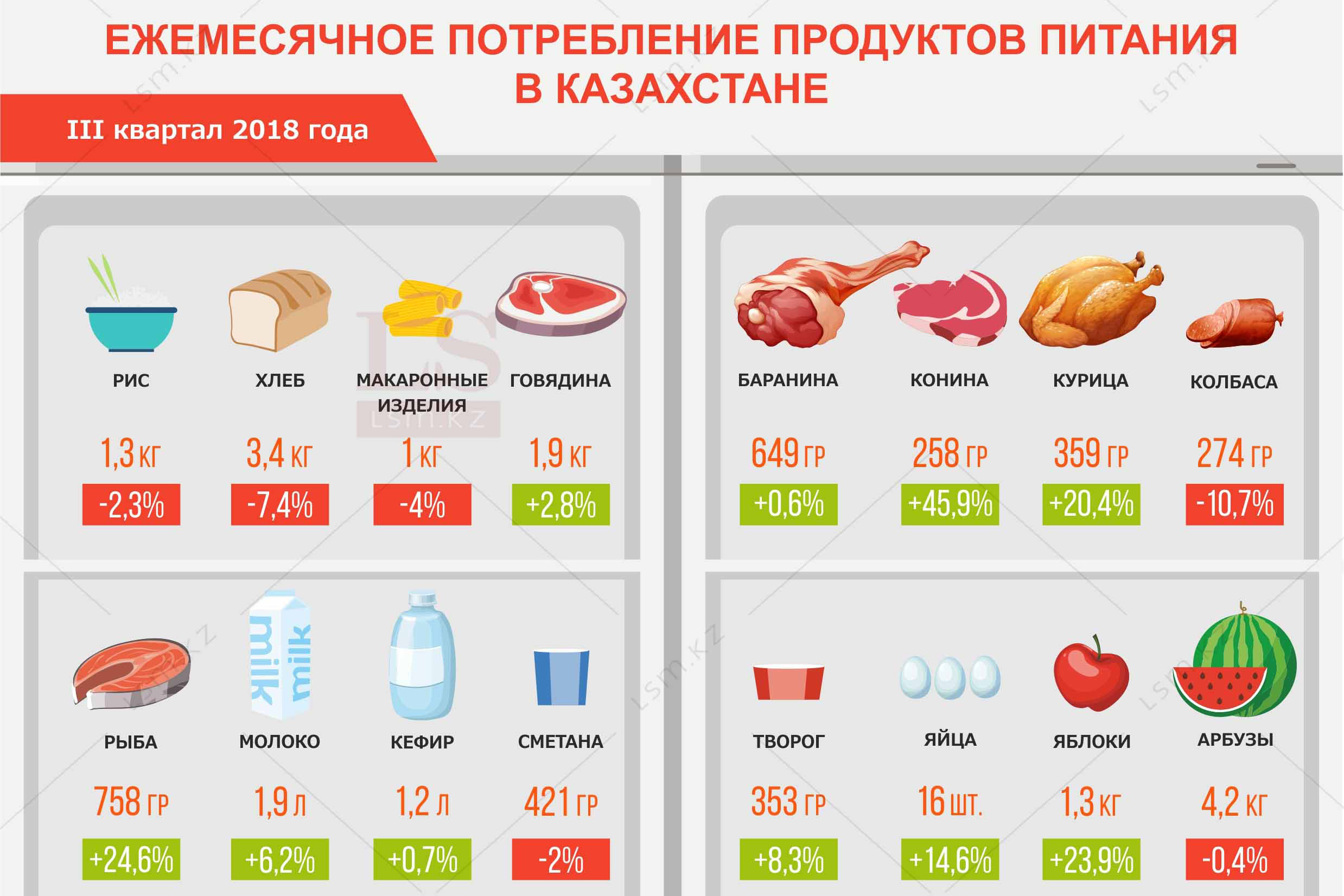 Ежемесячное потребление риса, хлеба и макарон в Казахстане в III квартале 2018 года сократилось на 2,3%, 7,4% и 4%, тогда как доля в рационе конины и курицы выросло на 45,9% и 20,4%, передает LS.