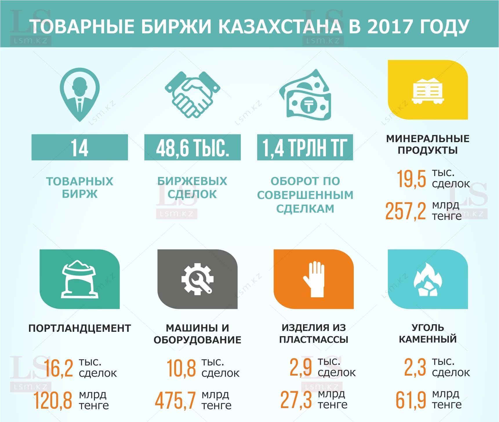 В 2017 году 14 товарных бирж Казахстана заключили 48,6 тыс. сделок на 1,4 трлн тенге , передает LS.