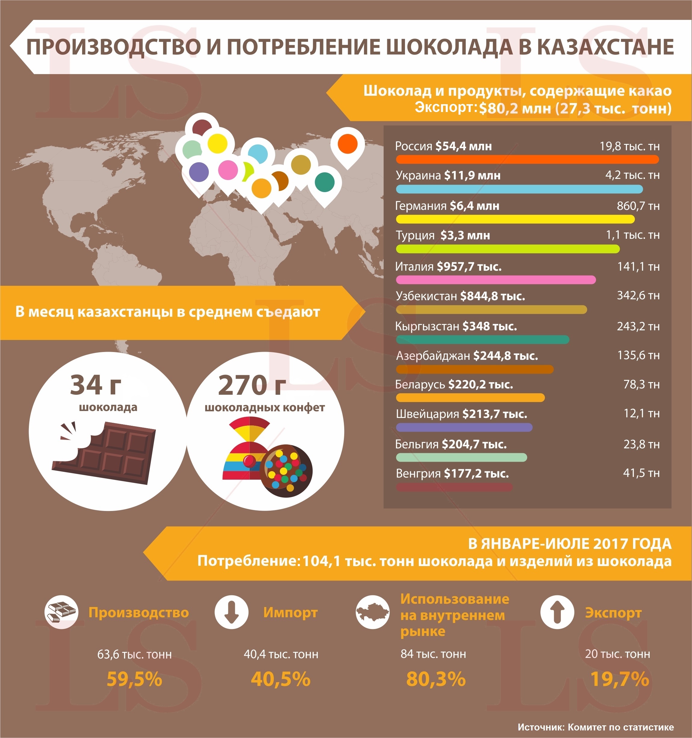 Потребление шоколада и изделий из какао в январе-июле 2017 года в Казахстане составило 104,1 тыс. тонн, передает LS.