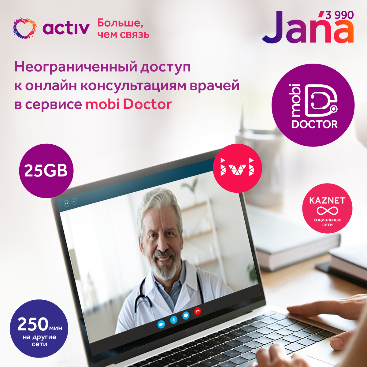 В данный момент пакет "Доктор" доступен для абонентов activ и включен в стоимость тарифного плана Jańa 3990. Кроме того, на данный тарифный план доступен upgrade в виде пакета "Доктор +" за доплату в размере 699 тенге в месяц. Сервис предоставляется на специальных условиях. В пакете "Доктор+" предусмотрено неограниченное количество консультаций с дежурным терапевтом или педиатром и более расширенная линейка услуг. Для сравнения стоимость разовой консультации с московским врачом составляет 6990 тенге.