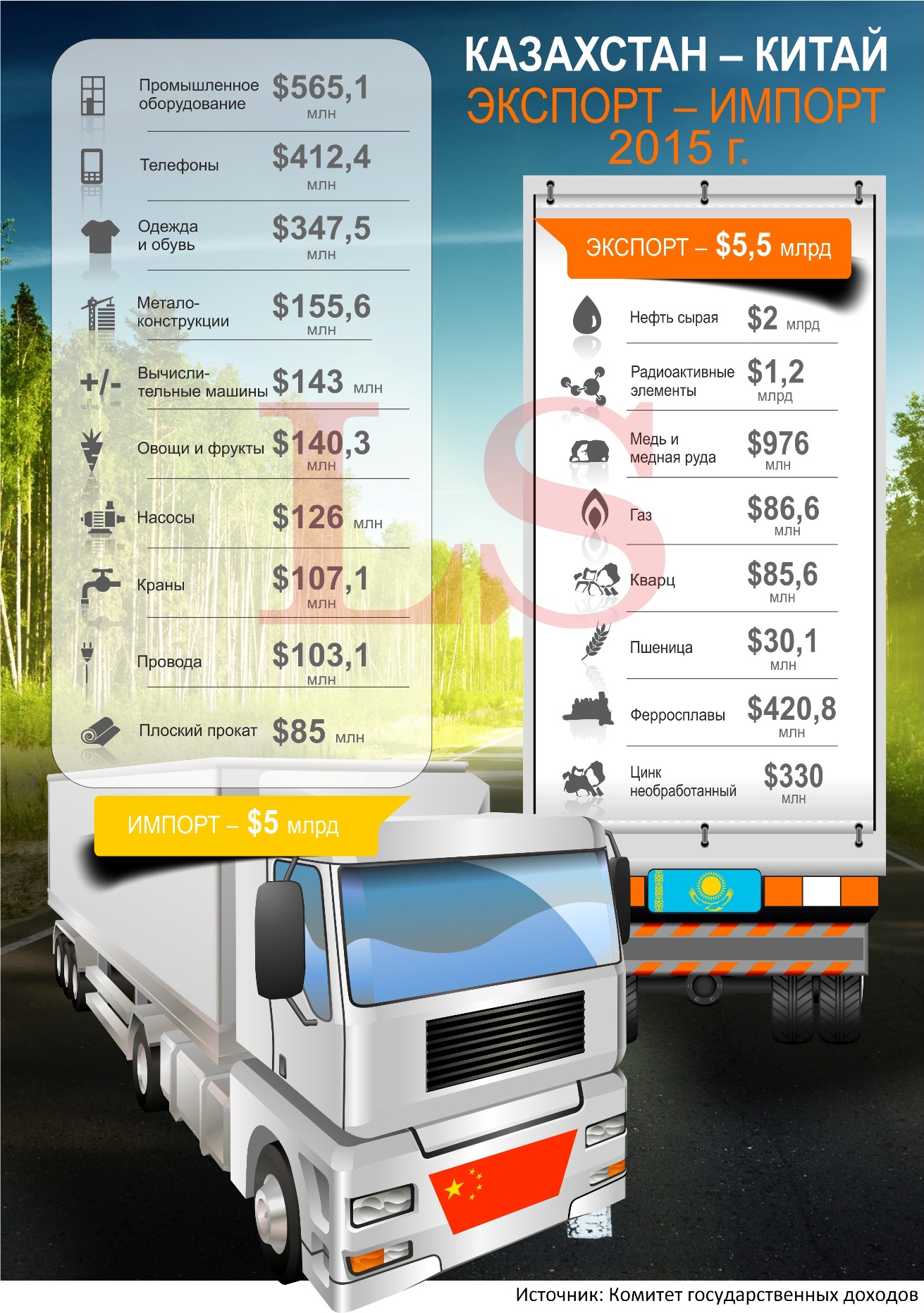 По данным комитета госдоходов, товарооборот двух стран в 2015 году cоставил $10,5 млрд. При этом импорт продукции в Казахстан достиг $5 млрд, а экспорт - до $5,5 млрд.