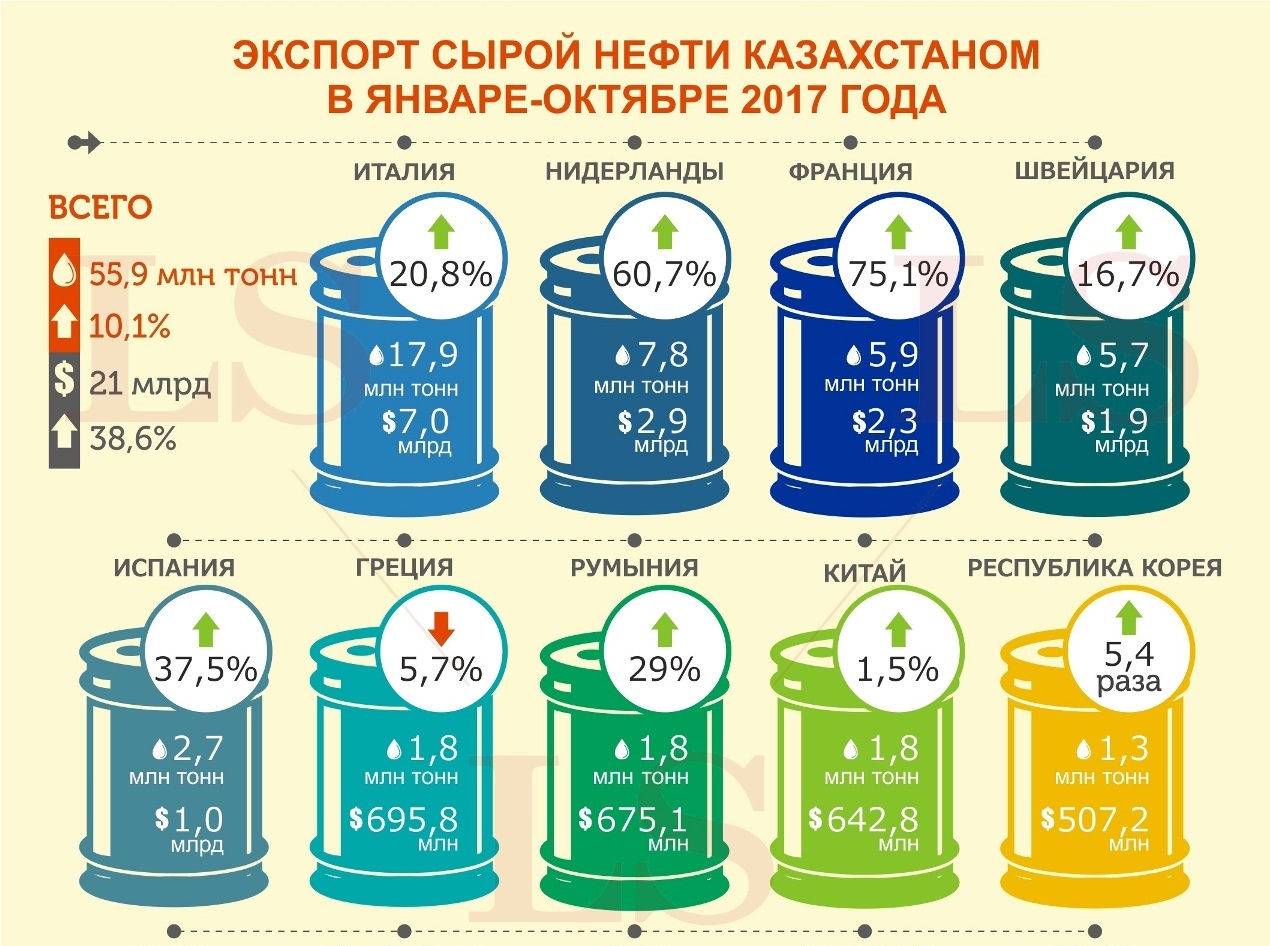 В январе-октябре 2017 года экспорт казахстанской нефти составил $21 млрд (55,9 млн тонн), передает LS.