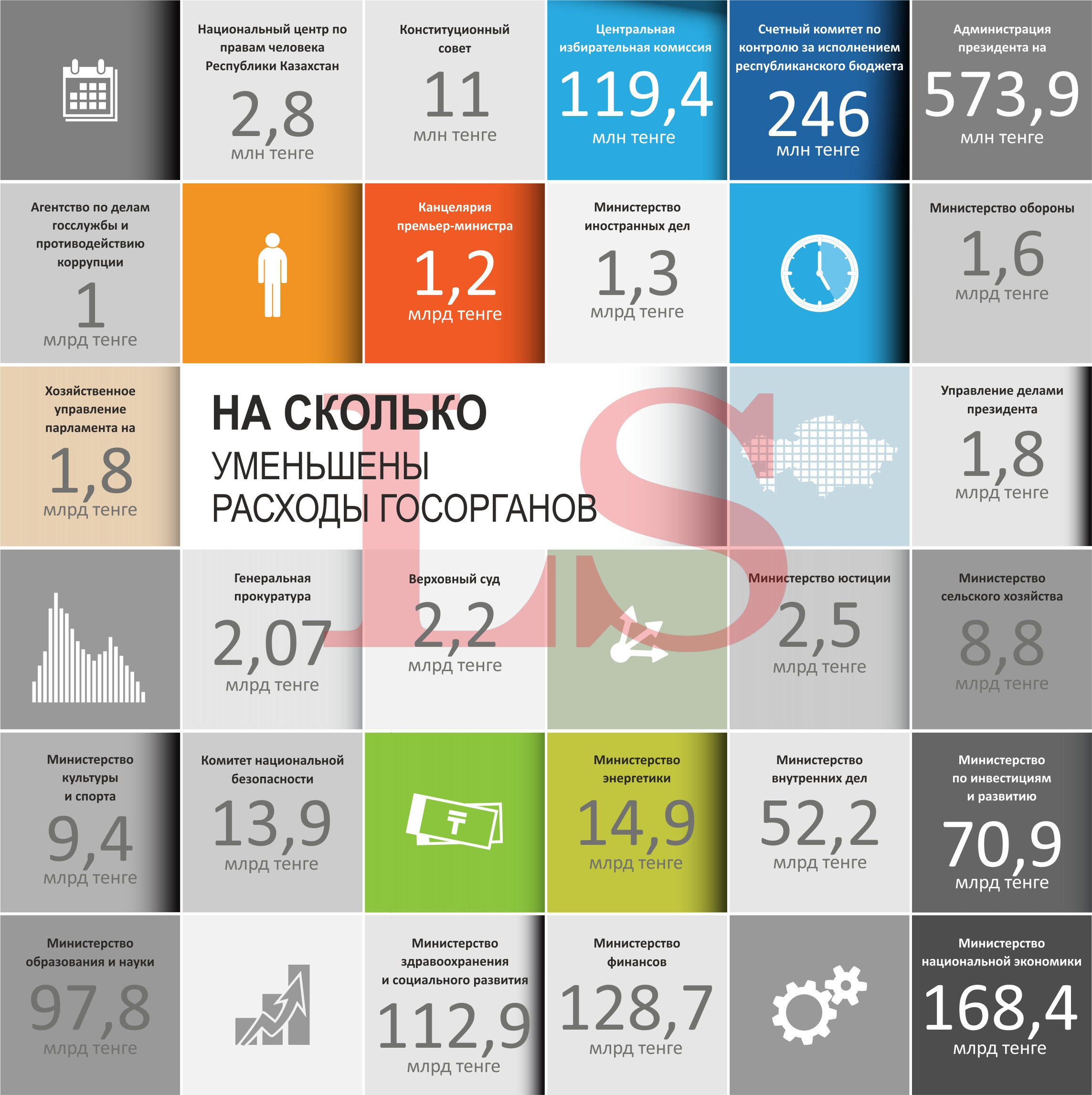 Ранее LS сообщал, что расходы республиканского бюджета Казахстана в 2015 году будут снижены на 610 млрд тенге до 7,2 трлн тенге. Отмечается, что уменьшение будет достигнуто за счет сокращения количества новых проектов и программ, и направлений с низкой или неподтверждаемой эффективностью, а также переноса сроков реализации социальных инициатив до 2016 года. Кроме того, будут сокращены административные, командировочные и представительские расходы.