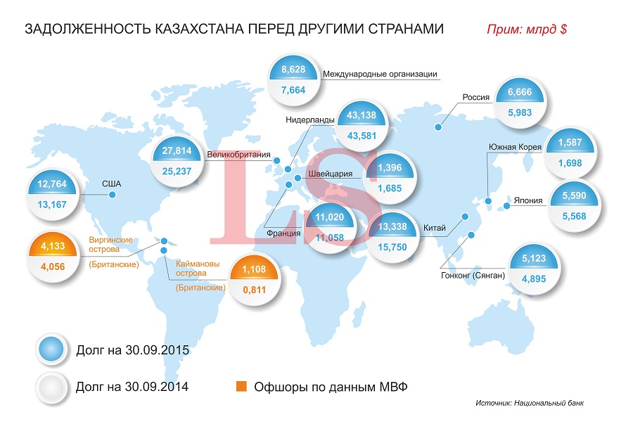 При этом республика увеличила долги перед Великобританией на 10,2%. Казахстан также имеет задолженность перед Виргинскими ($4,13 млрд) и Каймановыми островами ($1,1 млрд), которые являются офшорными зонами.