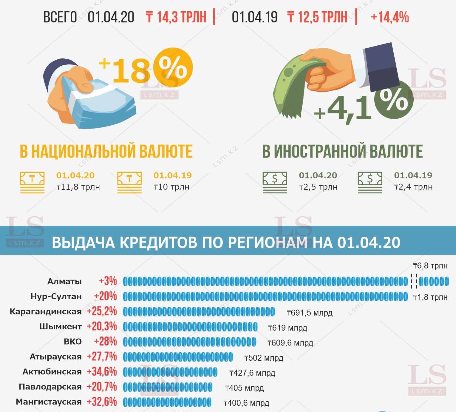 Между тем, по данным Нацбанка, на 1 апреля 2020 года банки выдали кредитов на 14,3 трлн тенге. Этот показатель за год вырос на 14,4%, или 1,8 трлн тенге. Большую часть займов оформили в нацвалюте – 11,8 трлн тенге (+18% за год).