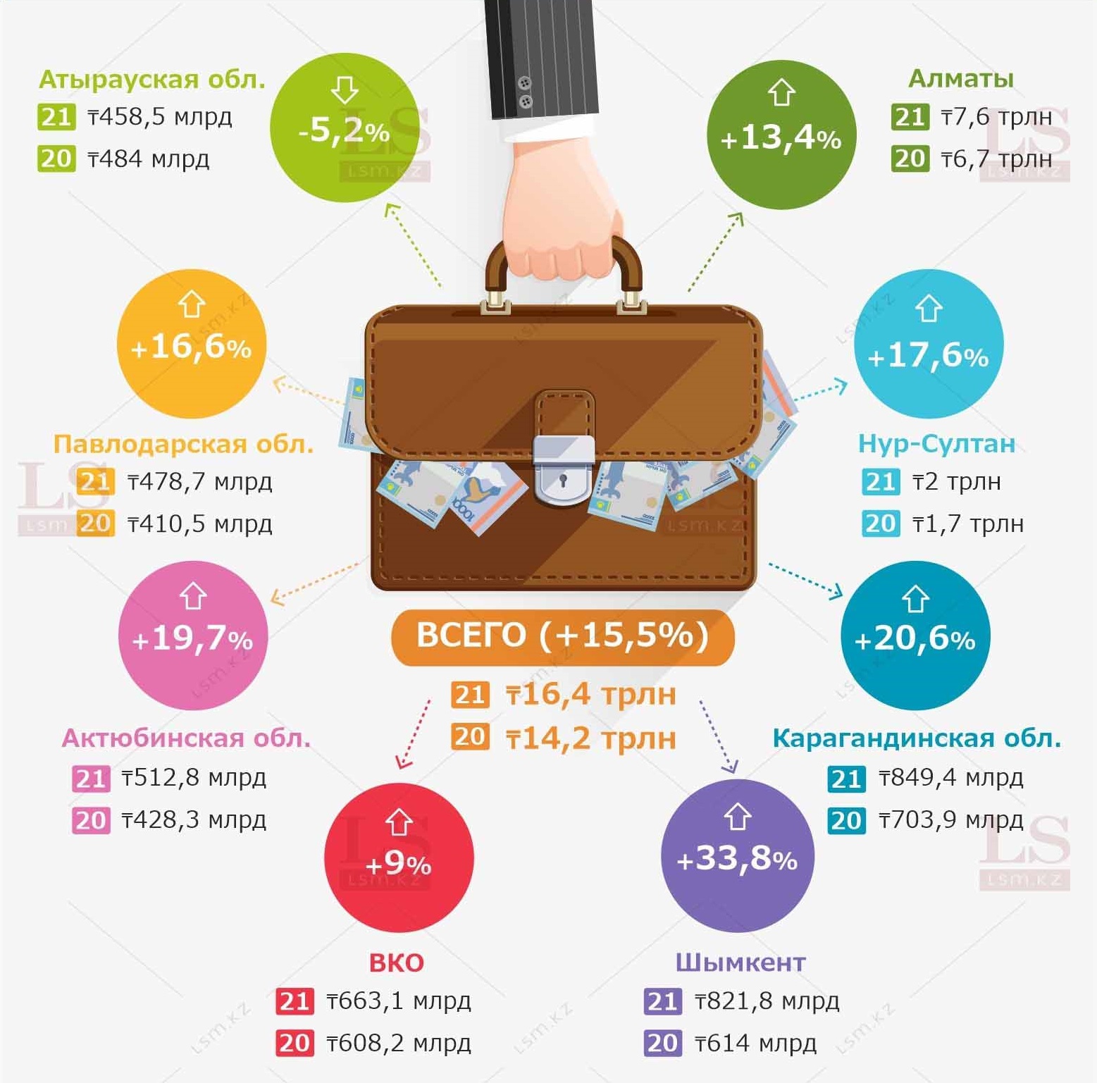 Казахстанцы продолжают активно брать кредиты. За год объем займов в отечественных банках вырос более чем на 2 трлн тенге. LS подготовил инфографику о том, в каких регионах брали больше всего в долг.