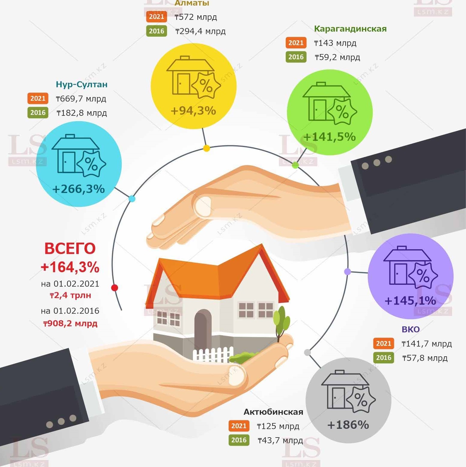 По информации Национального банка, на 1 февраля 2021 года фининституты выдали на ипотеку 2,4 трлн тенге. В то время как на аналогичную дату 2016 года – 908,2 млрд тенге. За пять лет объем вырос на 164,3%, или почти на 1,5 трлн тенге.